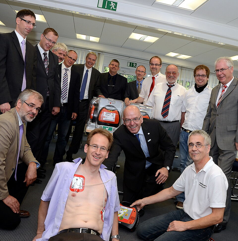 Das Bild für die Pressefotografen hatte irgendwie Symbolcharakter: Alle an der Pressekonferenz zur Vorstellung der 20 von der VR-Bank Nordeifel für die Eifelbevölkerung gespendeten Defibrillatoren zeigten sich von der Gemeinschaftsaktion von VR-Bank, Rotem Kreuz im Kreis Euskirchen und dem Bundestagsabgeordneten Detlef Seif sehr angetan. Rotkreuz-Kreisvorsitzender Erwin Doppelfeld und VR-Bank-Vorstandsvorsitzender Bernd Altgen konstatierten unisono: „Wenn mit einem dieser Geräte auch nur ein Menschenleben gerettet wird, dann hat sich die Anschaffung bereits gelohnt.“
