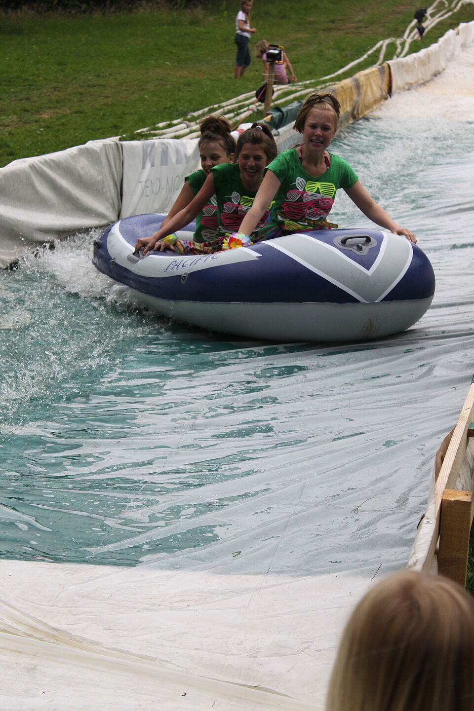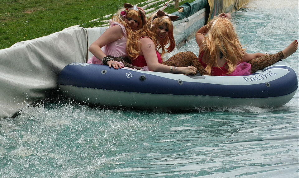 Nachdem die Teilnehmer bei der Siegerehrung für ihr bestes und schrillstes Outfit sowie für die schnellste Zeit geehrt wurden, startete der Junggesellenverein im Anschluss die Downhill-Schlauchboot-Party bis tief in die Nacht.