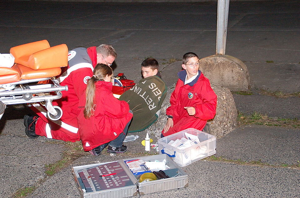 Stationiert im Gebäudekomplex "Transit 59", dem Stützpunkt der Rotkreuz-Bergwacht im Kreis Euskirchen, hatten die Jugendrotkreuzler am frühen Freitagnachmittag ihre Rettungswache bezogen. Wie bei den großen Kollegen standen zunächst Wacharbeiten wie die Kontrolle des Einsatzfahrzeuges, das Reinigen der Räume und Fortbildungsthemen auf dem Programm.