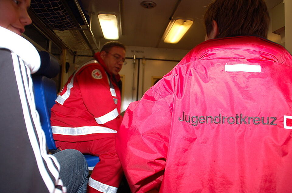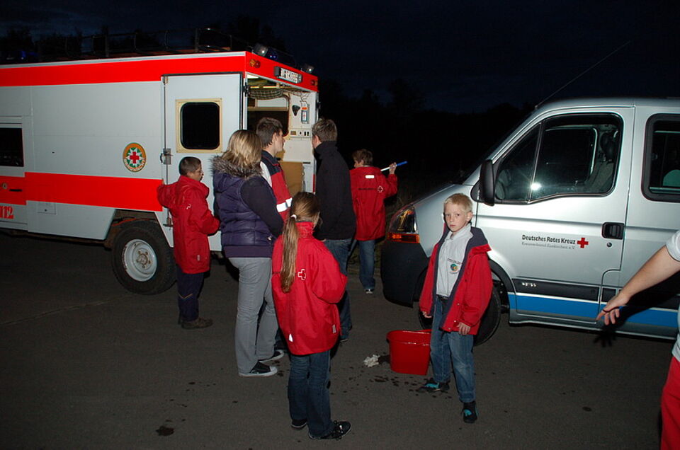 Frank Gummelt, Leitender Rotkreuzarzt im Kreis Euskirchen, und Stephan Schmitz, Euskirchener Rotkreuz-Gemeinschaftsleiter, statteten den Kids einen Besuch ab. Nach einer kurzen Talkrunde im Aufenthaltsraum alarmierte der Meldeempfänger zu einem weiteren vorgeblich schweren Unfall auf dem großen Parkplatz.