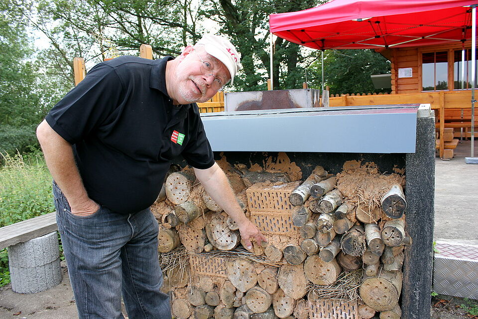 Bild DRK GA |Direkt an der Grillhütte mit Lagerfeuerstelle, die allen Gruppen zur Verfügung steht, hat das Rotkreuz-Team ein Insektenhotel gebaut, das DRK-Geschäftsführer Rolf Zimmermann präsentiert.