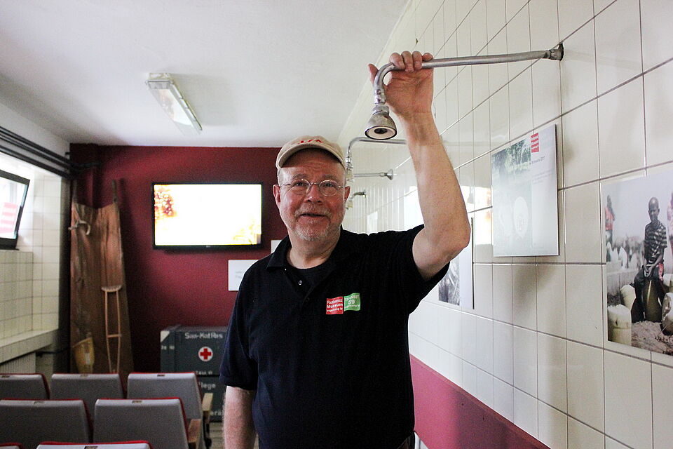 Immer wieder zeigt sich beim Rundgang auch, mit welcher Liebe zum Detail und welch kreativem Potenzial die Ausstellung konzipiert wurde. In den ehemaligen Duschräumen des Gebäudes etwa wurde ein Vorführraum eingerichtet, der mit Sitzen aus dem ehemaligen Gemünder Kino ausgestattet wurde, und in dem die Duschköpfe nach wie vor aus der Wand ragen. Zimmermann. „Dass wir immer wieder auch den Urzustand des Gebäudes mit einbeziehen, freut auch den Denkmalschutz.“ Die Geschichte des Roten Kreuzes erzählen unter anderem historische Feldtelefone. Hebt man den Hörer ab, startet ein „mp3-Player“, der die Historie mittels eines WDR-Beitrags nachzeichnet.