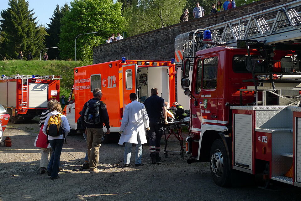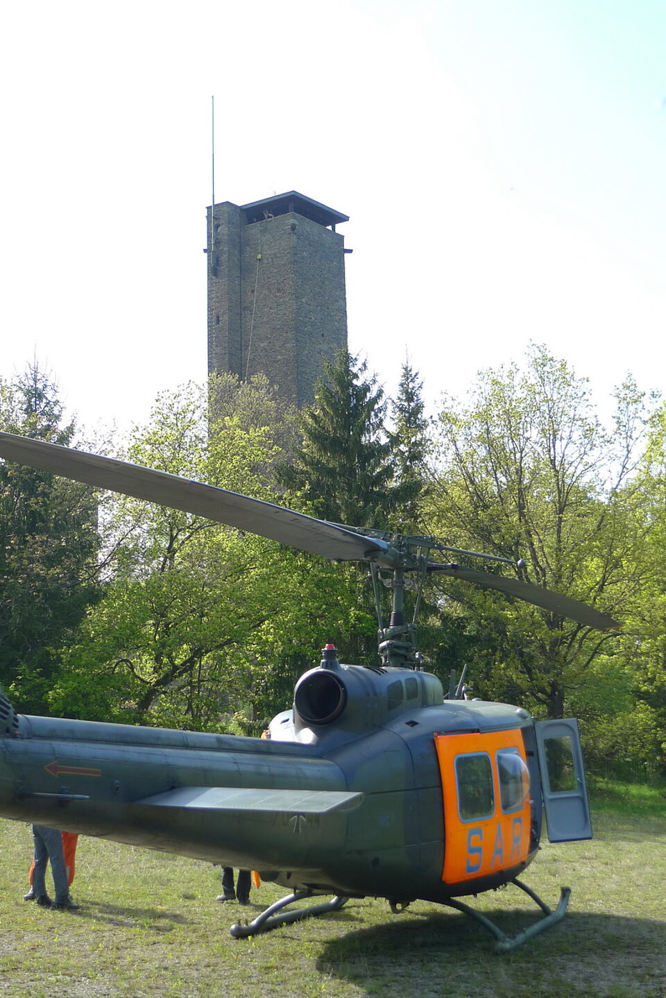 Kurz nach 15 Uhr erlitt ein 71-jähriger Mann auf der Aussichtsplattform einen Schwächeanfall. Die Rettungsleitstelle in Euskirchen alarmierte Rettungswagen, Notarzt, die Höhenrettungsgruppe der Berufsfeuerwehr aus Aachen und auch den SAR Hubschrauber aus Nörvenich (SAR 41, dieser hat auch einen Luftrettungsmeister an Bord).