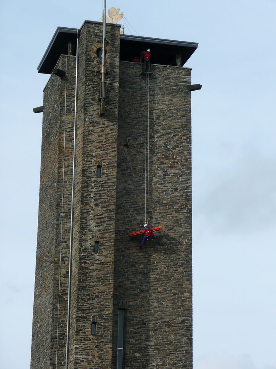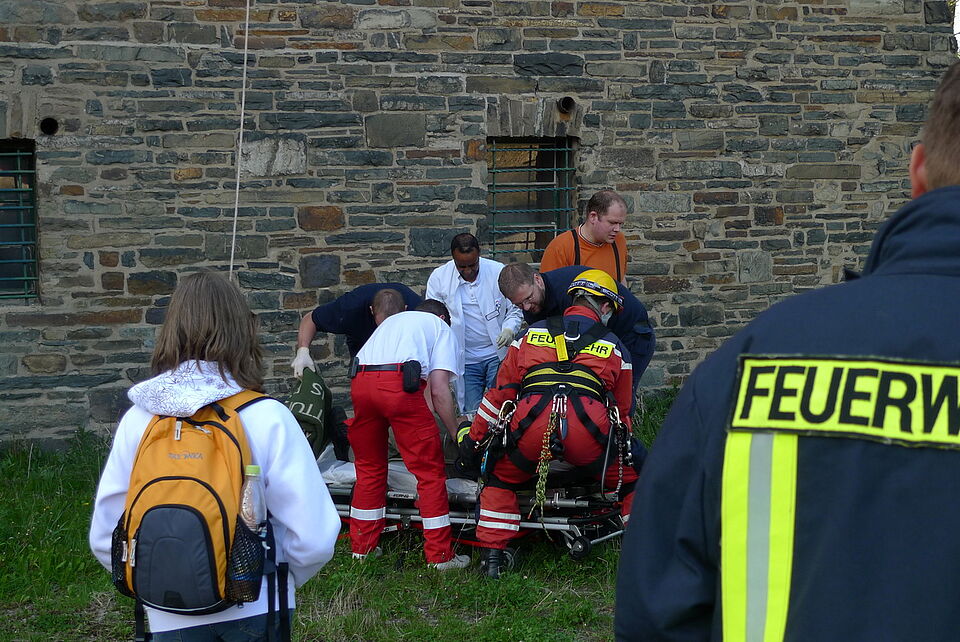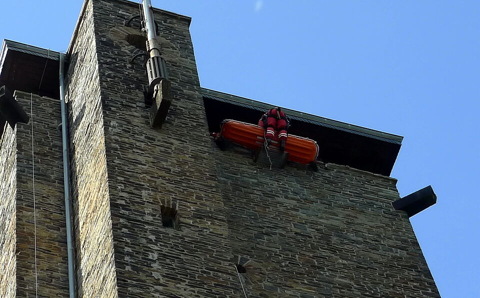 Schnell war klar, dass nur eine Rettung durch Abseilen an der Außenwand des Turmes in Frage kam (genau diese Maßnahme hatte eine Gruppe der Rotkreuz -Bergwacht aus dem Kreis Euskirchen im November 2008 am Turm geübt). Die Brüstung des Turmes hat eine Höhe von 43 Metern und die Drehleiter der Feuerwehr aus Schleiden erreicht nur etwa 25 Meter. Ein Transport durch die enge und steile Wendeltreppe war nicht möglich.