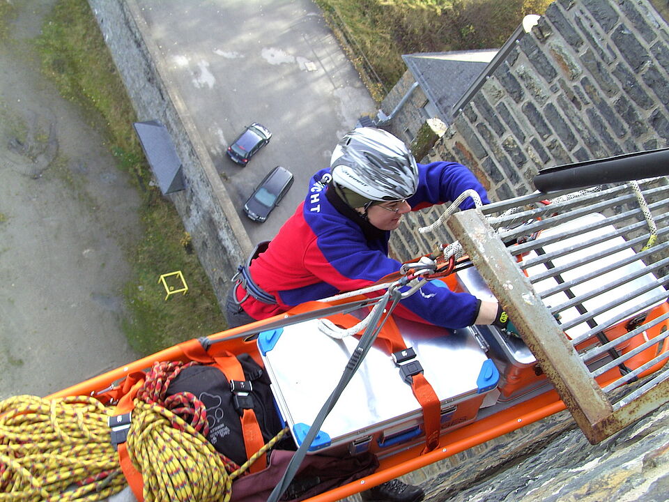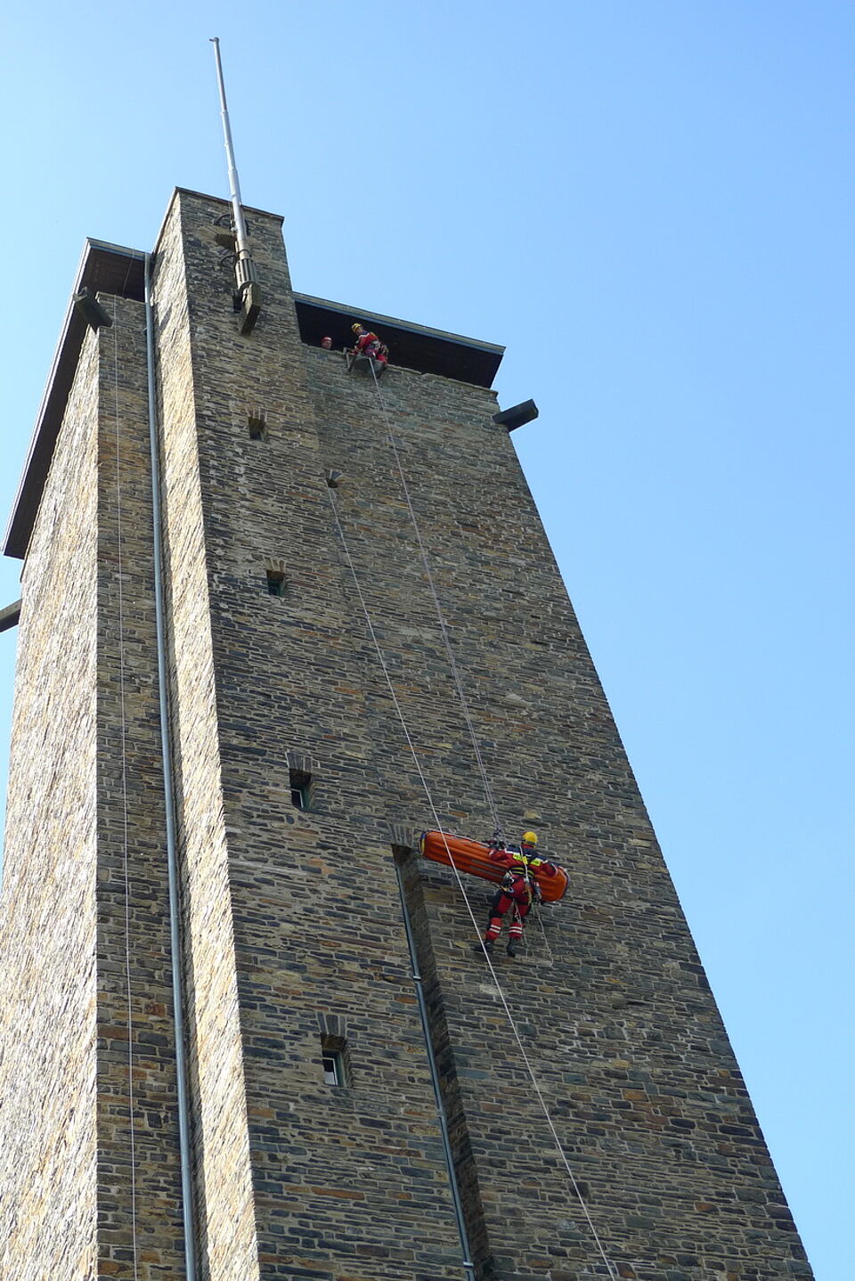 Nachdem der Mann von einem Notarzt versorgt und die Höhenrettungsgruppe aus Aachen eingetroffen war, wurde das Abseilen von den Höhenrettern begonnen. Das notwendige Rettungsgerät (so z.B. eine Schleifkorbtrage, technisches Abseilmaterial und verschiedene Seile) wurde auf den Turm gebracht. Die Retter orientierten sich auf dem Turm und seilten später den Mann in der Schleifkorbtrage ab.