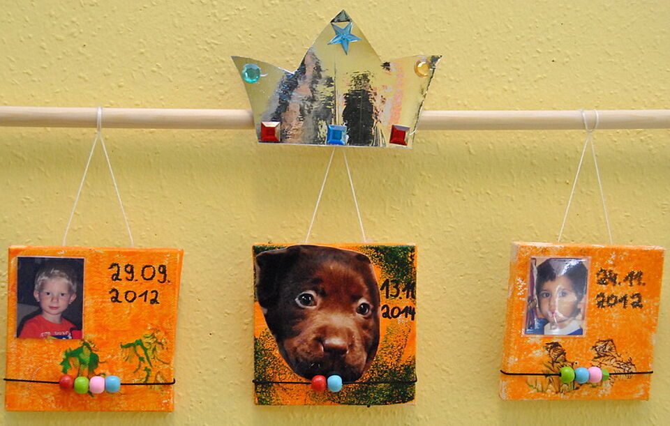 Dass die Hündin vollwertiges Mitglied der Kindertagesstätte ist, beweist ihr Platz im Geburtstagskalender: Das Krönchen, mit dem das aktuelle Geburtstagskind markiert wird, prangt im Oktober über Hollys Foto: Am 13. Oktober wurde sie drei Jahre alt – vorbei ist damit ihre U-3-Zeit.