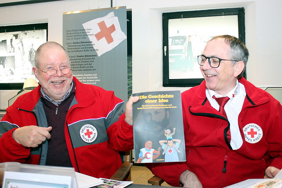 „Alle teilnehmenden Gruppen erhalten eine kostenlose Führung durchs Rotkreuzmuseum“, verspricht der Schleidener Ortsvereinsvorsitzende. Die ersten drei Gewinner können sich auf hochwertige Preise ganz im Sinne der Rotkreuz-Jugendarbeit auf Vogelsang freuen: Es winken drei-, zwei- oder eintägige Klassenprojekte in Vogelsang inklusive Unterkunft, Verpflegung und Programm. „Zur Unterstützung gibt’s für jede Schule ein Starterpaket“, berichtet Rolf Zimmermann und zeigt auf bis zum Rand gefüllte Plastikkisten. Darin enthalten: Zehn Exemplare des Buchs „Menschenmenge“ zum Thema Menschenwürde und Werte, zwei Comics „Geschichte einer Idee“ zur Entstehung und Entwicklung des Roten Kreuzes sowie 20 Programmhefte der Rotkreuz-Akademie.