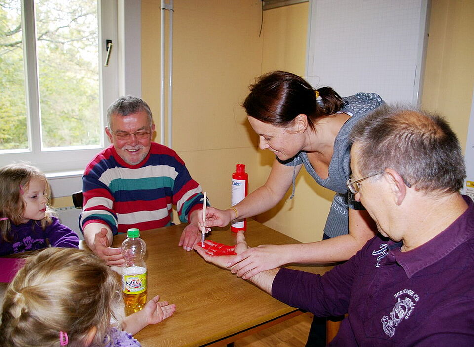 Das zweijährige Projekt „Die neuen Großväter in Aktion“ entwickle sich bislang qualitativ und quantitativ gut und solle im kommenden Jahr intensiviert werden. „Es ist vom Generalsekretariat als erfolgreich eingestuft worden.“ Die Großväter-Arbeit des Euskirchener Kreisverbandes lobte Dr. Mosemann als „Leuchtturm“. Auf dem letzten Stück der Wanderung hatten die Kinder und Opas Zuwachs bekommen. Vom Bundesverwaltungsamt, das das Projekt administrativ unterstützt, waren Michael Impertro und Franz Wozniak nach Vogelsang gekommen. „Aus dem hohlen Bauch heraus gesagt: Ich fand es klasse“, zeigte sich Michael Impertro ganz angetan. Franz Wozniak erklärte, solche Projekte seien wichtig für das Verständnis zwischen den Generationen. Das entwickle sich schließlich von klein auf. Eine bleibende Erinnerung gab es am Schluss für beide Generationen. Tina Mertens hatte Papp-Herzen vorbereitet, auf denen Opa und Enkel je einen farbigen Handabdruck hinterließen. Die Herzen werden ihren Platz in der Kita finden.