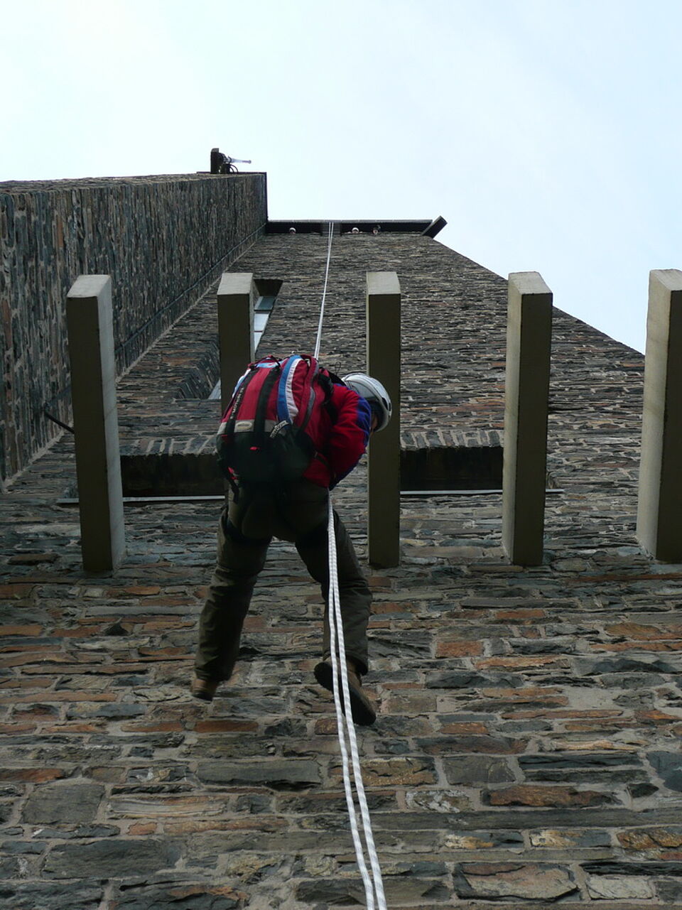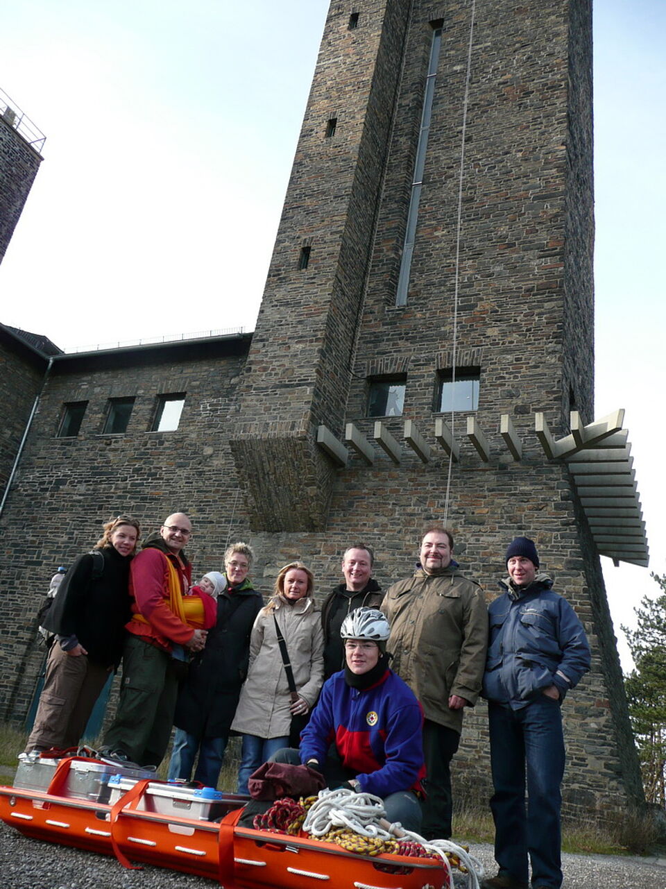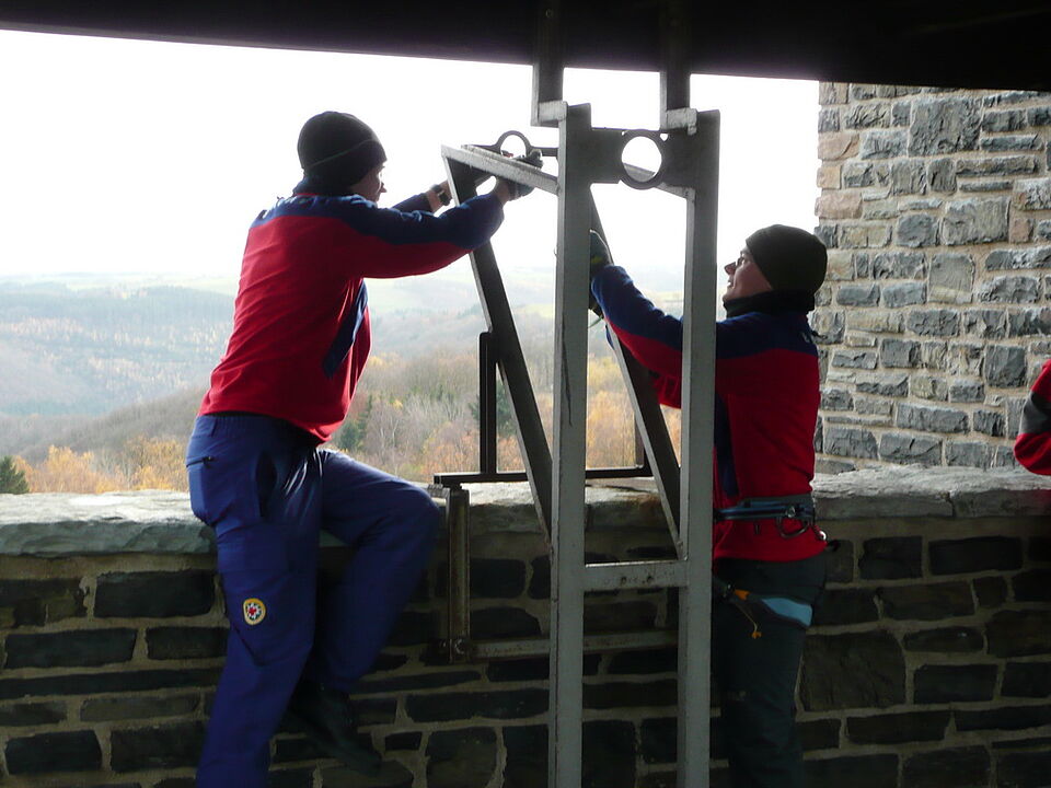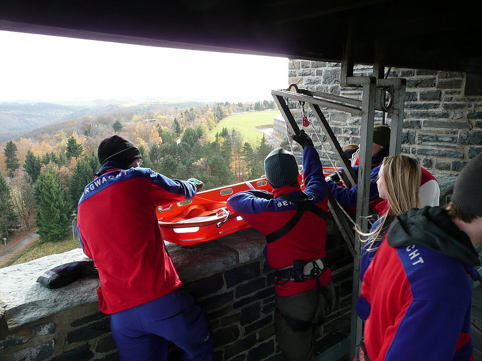 Sicherheit steht immer an erster Stelle. Deshalb übte die Rotkreuz-Bergwacht die Rettung verletzter oder erkrankter Besucher vom Plateau des Turms auf "Burg Vogelsang".