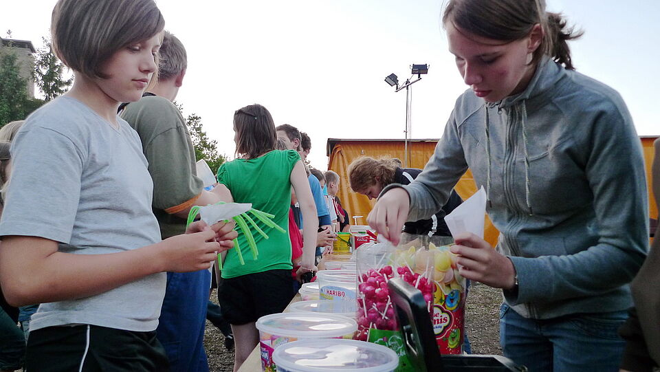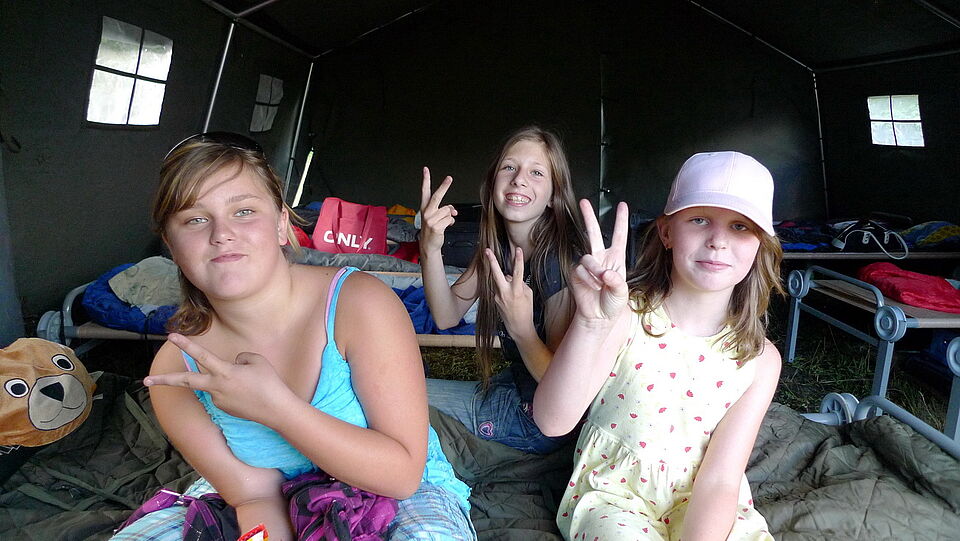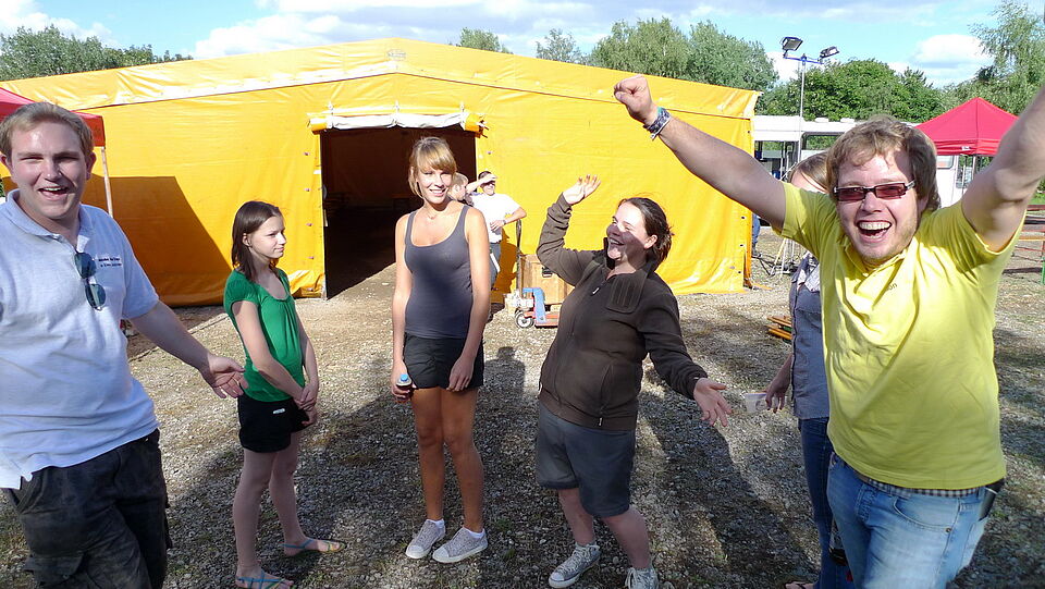 Abends änderte sich kurzzeitig das Wetter, und es regnete stark, so dass einzelne Zelte voll zu laufen drohten. Schnell organisierten die Jugendlichen Schaufeln und Spitzhacken und zogen, wie sonst in Hochwassereinsätzen die "Großen ihrer Organisation", Wassergräben und verbauten vom THW herbeigebrachte Sandsäcke. Jeder half mit, auch wenn sein Zelt im Trockenem stand! So schaffte es das Team, dass alle Zelte innen trocken blieben.