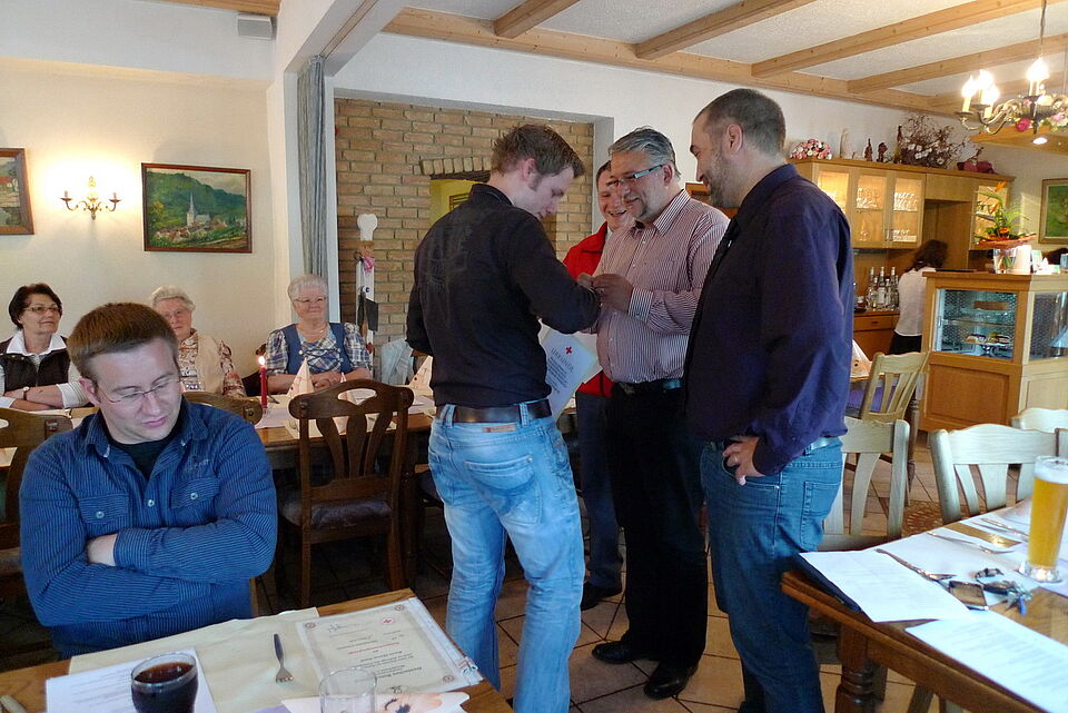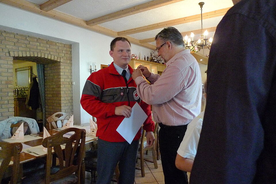 Bild DRK SP | Hier erhält Christopher Kettner (Bereitschaftsleiter) seine Anstecknadel für 15 Dienstjahre im Ortsverein.