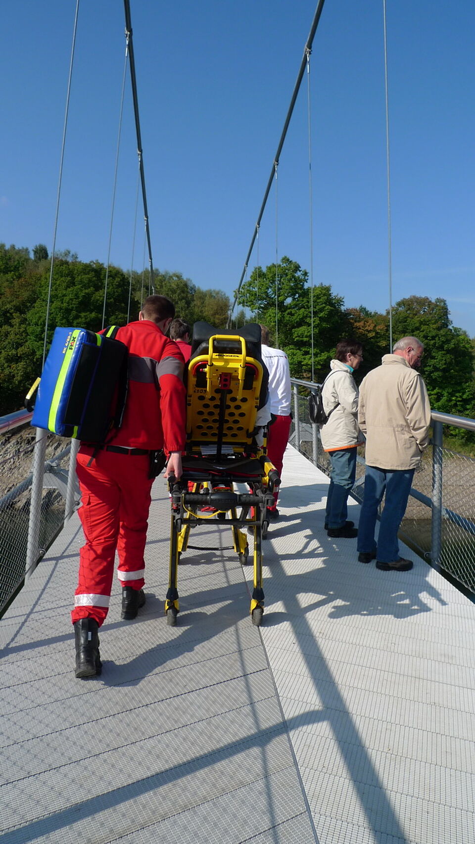 Schon während der Ansprachen von Landrat Günter Rosenke und Minister Lienenkämper hatte das Rotkreuzteam einen ersten Einsatz auf der Brücke.