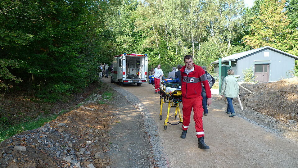 Bereits während der Brückeneröffnung musste der Rotkreuz-Rettungswagen das erste Mal in den Einsatz. Einer älteren Dame ging es nicht gut. Die Rotkreuzler konnten jedoch schnell Hilfe leisten. Einige Zeit später erhielten die diensthabenden Rettungskräfte die Einsatzmeldung: "Person mit Herzbeschwerden in Richtung Wollseifen". Jetzt musste es wieder schnell gehen!
