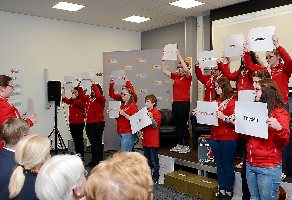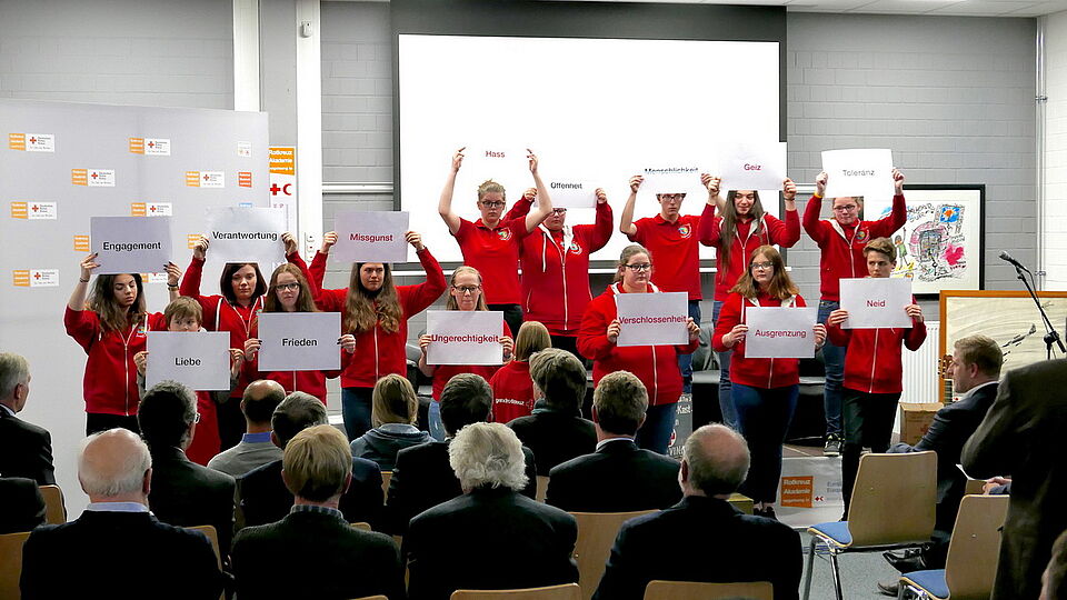 Seit der ersten saisonalen Rotkreuzmuseumseröffnung vor fünf Jahren gehört jeweils eine besondere Performance des Jugendrotkreuzes als Schlussakt zu den Höhepunkten. So auch diesmal: Die Rotkreuz-Jugendlichen trugen sinnbildlich Werte auf die Bühne. Und zwar positiv und negativ belegte Werte wie Missgunst, Neid, Geiz und Hass.