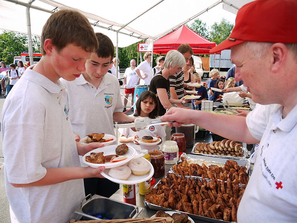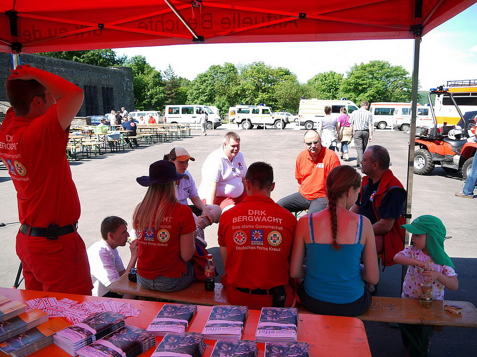 Mit einem interaktiven Spiel mit sieben Masken zu den sieben Rotkreuz-Grundsätzen zeigten Jugendrotkreuzler außerdem die bunte Vielfalt des Roten Kreuzes unter freiem Himmel. Besonderen Dank ernteten Geschäftsführer Rolf Zimmermann und seine engagierten Organisatoren aus allen Eifeler Rotkreuzgemeinschaften, allen voran die Top-Verpflegung des Teams von Angelika und Herbert Schmitz sowie die Allround-Betreuung der Bergwacht. Auch die Zusammenarbeit mit der Schminkgruppe des Jugendrotkreuz (JRK) Neuss bewährte sich: „Wir kommen sehr gern wieder, wenn die Wasserwacht ruft“, lobte Teamchefin Uschi Schneider.