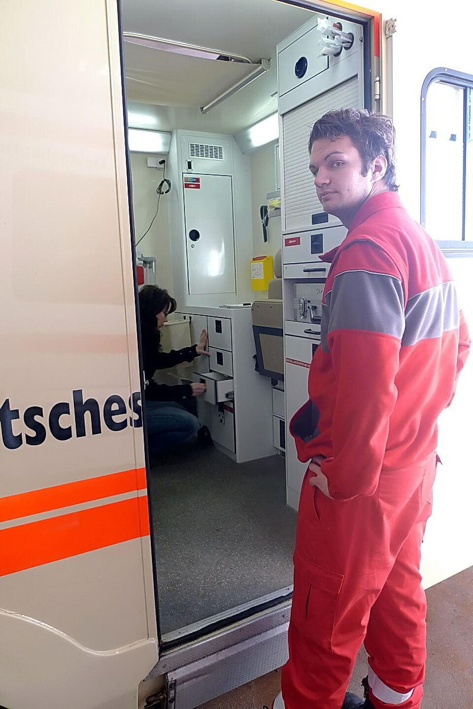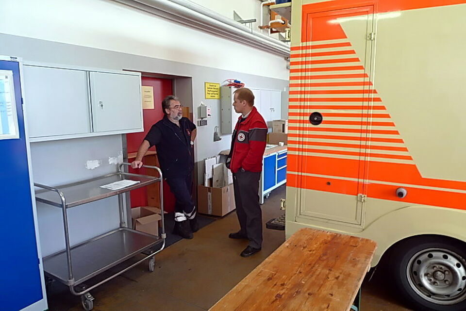 Bild DRK SN | Manuel Iskra (r), der Mechernicher Rotkreuz - Gemeinschaftsleiter, bei der Prüfung "seines" Rettungswagens