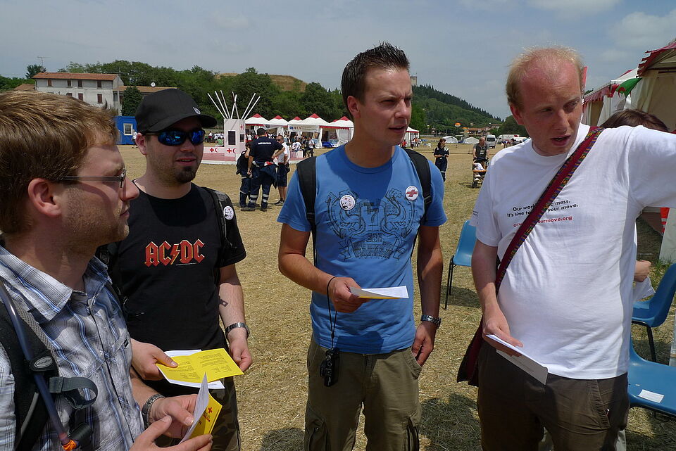 Nach einer Führung durch das Museum fuhr die Gruppe am Nachmittag zum ersten Mal in das Camp am Rande von Solferino, in dem über 7000 Rotkreuzler aus vielen der 152 Rotkreuz- und Rothalbmondgesellschaften weltweit zusammengekommen waren, um die Entstehung der Rotkreuzidee vor genau 150 Jahren zu feiern. Es herrschte eine tolle Stimmung, und man konnte Menschen aus vielen verschiedenen Ländern kennenlernen.