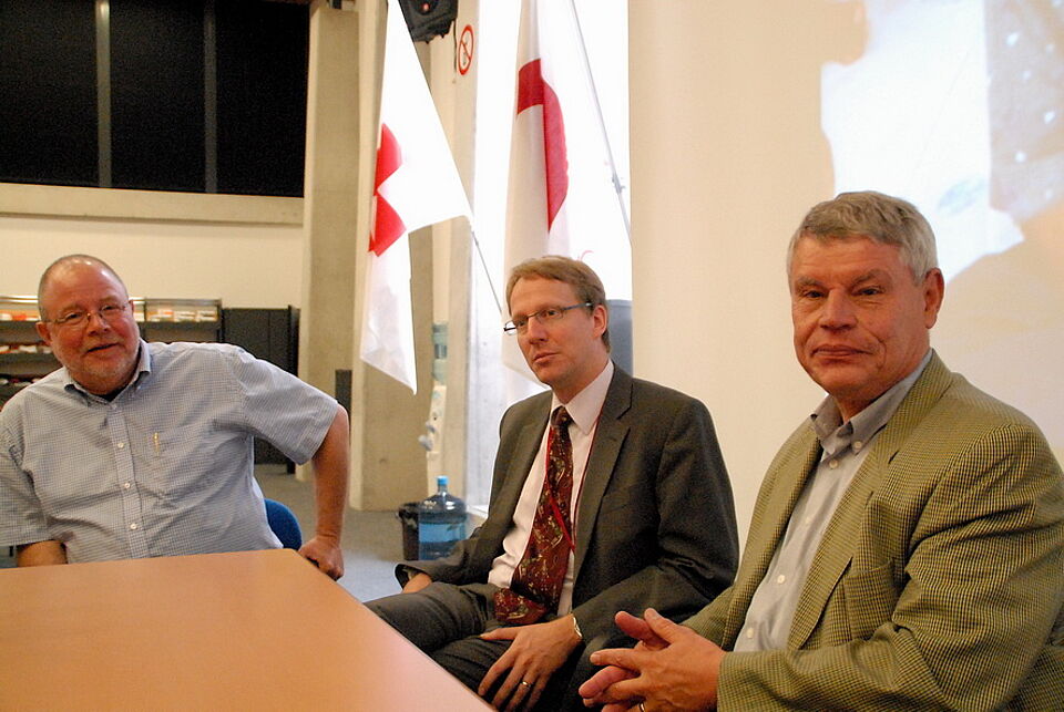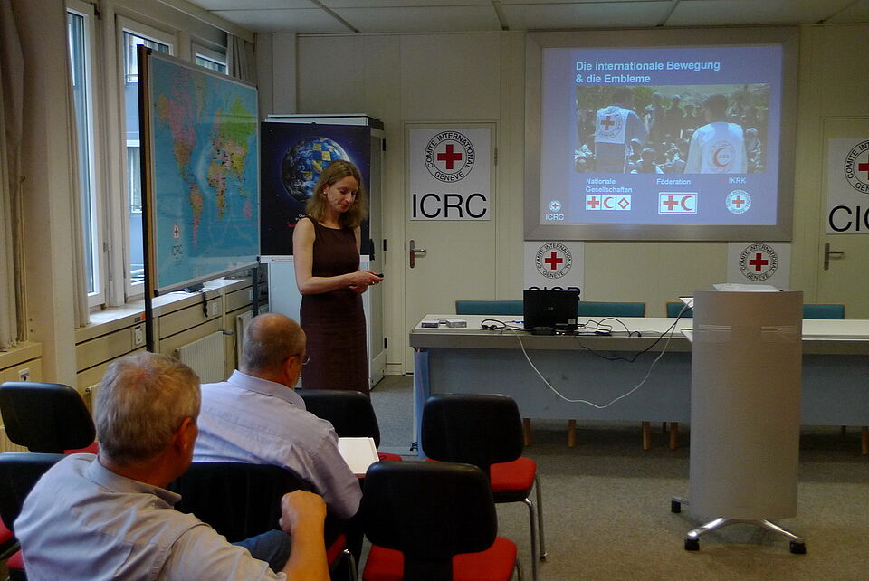Beatrijs Vanhove, die Leiterin Besucherservice beim IKRK, hatte die Deutschen zuvor begrüßt und die auf Krisen- und Kriegsgebiete beschränkten Tätigkeitsfelder des IKRK umrissen. Menschlichkeit, Unparteilichkeit, Neutralität und Unabhängigkeit sind der so genannte „Modus operandi“ des im Gegensatz zur international besetzten Föderation von Schweizern geführten IKRK.