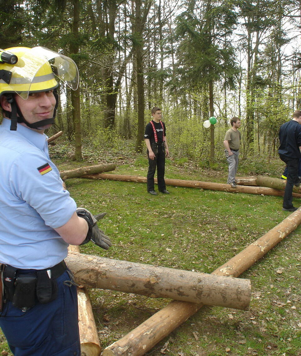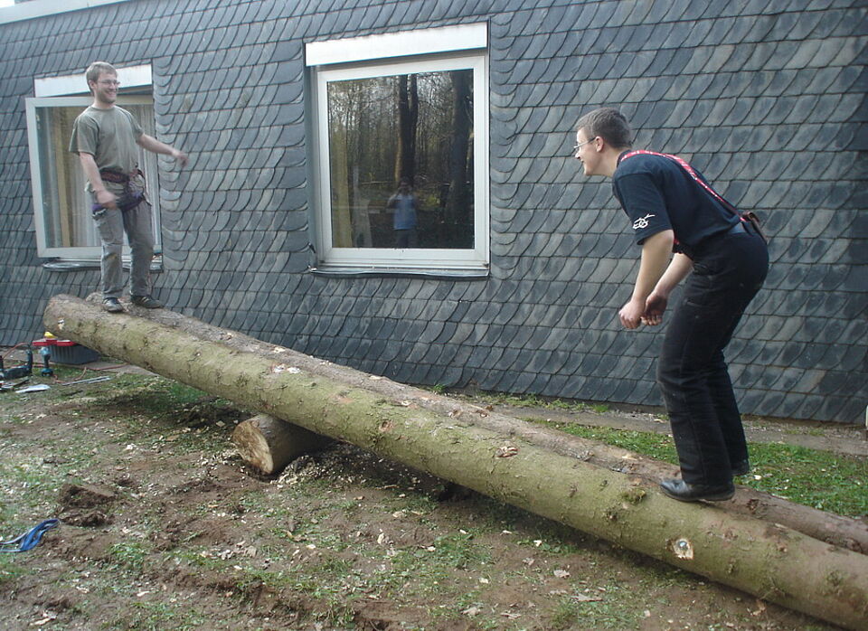 Ein freundlicher Nachbar hatte die mächtigen Fichtenstämme gestiftet, die von den Helfern mit technischer Unterstützung und viel Muskelkraft an die richtigen Stellen gebracht wurden. Das Gelände wurde von den Einsatzkäften des THW geräumt, Wurzeln entfernt und die Fläche gesäubert. Dann begann das Sägen, Bohren und Schrauben.