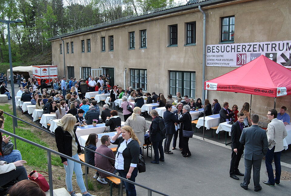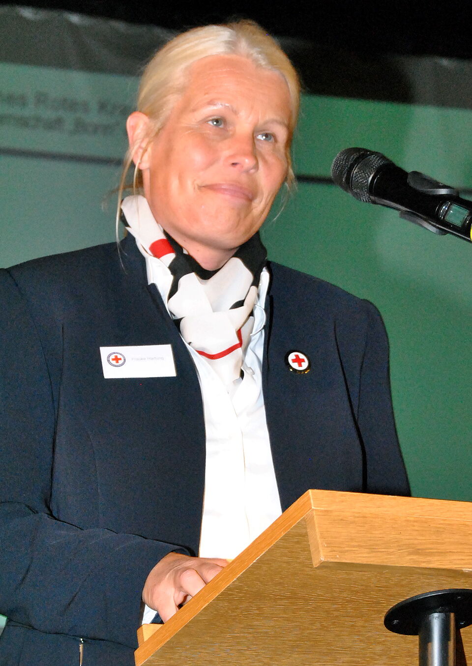 Zum Abschluss des zweistündigen Festaktes sorgte die Kommunikations- und Humortrainerin Margit Hertlein mit ihrem witzigen Ausflug in die Evolution von Krokodilen und Menschen für Heiterkeit. Mit leichter Hand verband sie Humor, Erfolg im Umgang mit Pflegedürftigen und Autofahrern mit Gehirntheorie und verriet, warum Lachen tatsächlich schlau macht. Auch sie wurde mit einem begeisterten Applaus von der Bühne entlassen. Anschließend stellte das Rotkreuz-Küchenteam wieder einmal seine Leistungskraft unter Beweis und bewirtete mehrere hundert Hungrige an verschiedenen Plätzen im und am Kulturkino. Aktionen, Ausstellungen und Führungen durch das Rotkreuz-Museum rundeten den Tag für die Festgäste ab.