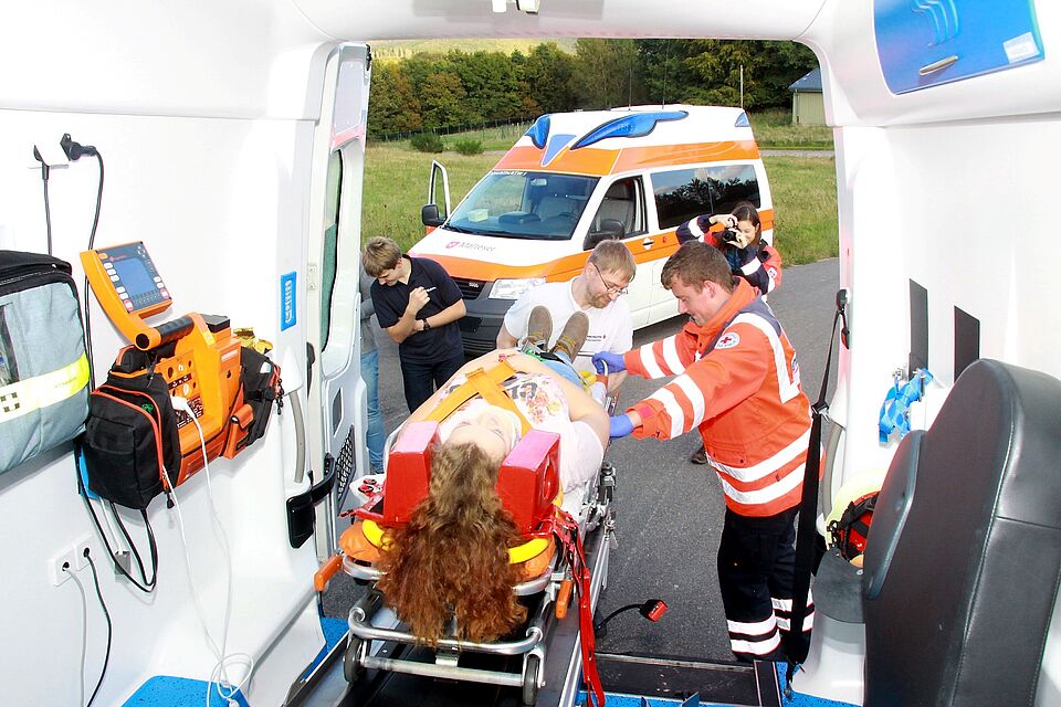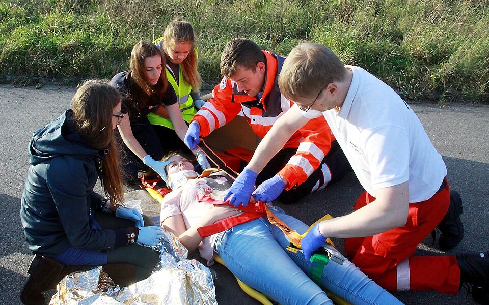 „Eine bewusstlose Person, eine leichtverletzte und ein Unfallopfer mit Schock“ - so sah die Aufgabe aus, der sich die Jungen und Mädchen stellen mussten. Nachdem sie die ersten Handgriffe getan hatten, rückten, wie bei einem realen Notfall mit Blaulicht und Martinshorn, die ausgebildeten Rettungssanitäter an. Sie zeigten den Ersthelfern, wie sie selbst arbeiten. Mit dem Spineboard, dem festen, wirbelsäulenschonenden Transportbrett, wurde beispielsweise die vermeintlich Bewusstlose ins Auto gehoben. Währenddessen demonstrierte Rolf Zimmermann an anderer Stelle mit Hilfe moderner Elektronik, wie ein Notruf richtig abgegeben wird. „Das ist eine App für Ipad oder Handy“, sagte er und zeigte auf das Programm. Dann ergänzte Zimmermann: „Die Schüler machen das richtig gut.“
