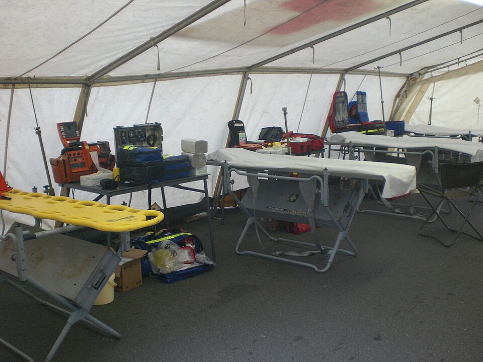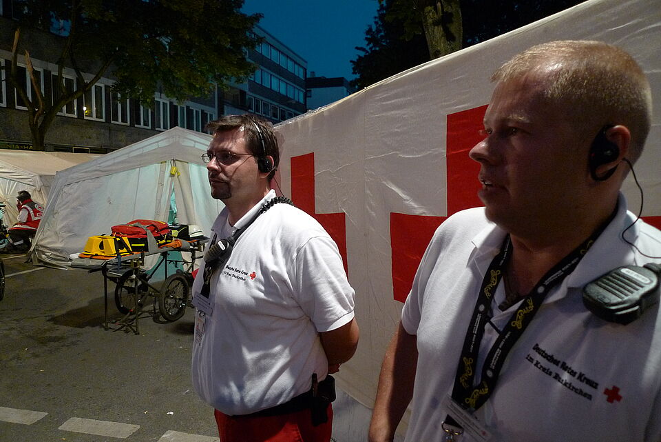 Nachdem wir zügig alles aufgebaut und eine kurze Einsatzvorbesprechung vollzogen hatten, waren wir auch schon einsatzbereit und warteten auf die ersten Hilfesuchenden. Diese ließen zunächst auf sich warten, da die Raver vom Bahnhof friedlich und geordnet zum Festivalgelände strömten. Im Laufe des Tages gab es aber dann doch einiges zu tun, wenn auch nie alle 3 Erst-Versorgungs-Trupps (3 Helfer, die Verletzte mittels Trage und Notfallrucksack zu einer Unfallhilfsstelle bringen) gleichzeitig zum Einsatz kamen. Vom Ereignis im Tunnel bekamen wir Informationen durch die Leitung der UHS mit der Anforderung, uns sofort einsatzbereit zu machen, um bei Notwendigkeit dort eingesetzt zu werden. Die Lage wurde als „ MANV“, also Massenanfall von Verletzten gemeldet. Da unsere Unfallhilfsstelle aber relativ weit vom Katastrophenort entfernt war, kamen wir nicht zum Einsatz am Tunnel. Wir hatten aber auch in unserer Unfallhilfstelle alle Hände voll zu tun. Viele, die bei der Massenpanik leicht verletzt wurden, suchten bei uns Hilfe und wurden dann versorgt. Überwiegend handelte es sich um kleinere Verletzungen, aber auch einige Drogen- und Alkoholvergiftungen mussten wir zusammen mit der uns zugeteilten Ärztin behandeln.