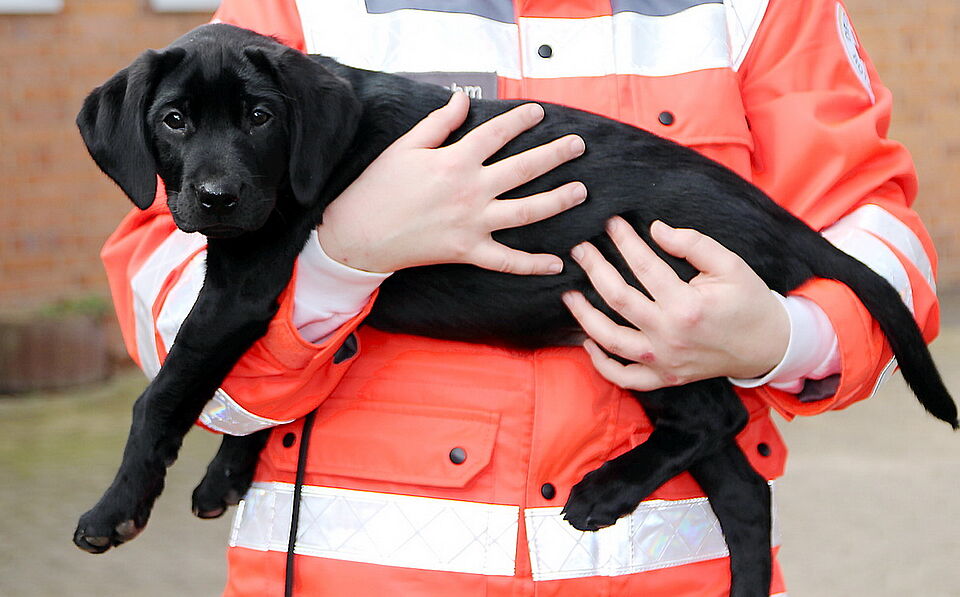 Dann eroberte der kleine Überraschungsgast „Emma“ die Kinderherzen im Sturm. Der neun Wochen junge Labrador-Welpe von Carmen Dahm steht noch ganz am Anfang seiner rund zweijährigen Ausbildung und war gleich der Star bei den Kindern. Außerdem hatte die DRK-Hundeführerin auch noch ihre erfahrene Labrador-Hündin „Lucy“ dabei.