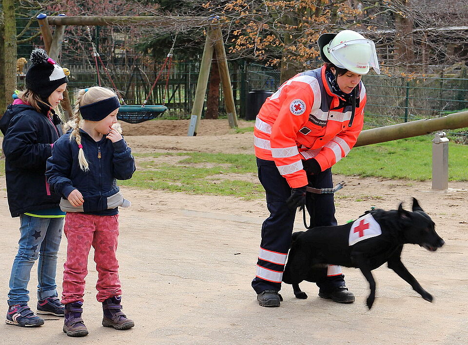 Auf dem Außengelände zeigten die Mensch-Hunde-Teams praktische Übungen und verschiedene Ausbildungsschritte. Begeistert verfolgten die Kinder, wie brav „Lucy“, „Cooper“, „Musher“ und „Ben“ gehorchten. Es wurde beispielsweise vorgeführt, wie sich der Hund bei einem Fund verhält, indem er laut bellt. Belohnt wurden die Vierbeiner anschließend mit einem spannenden Spiel mit dem Futterbeutel oder einem Spielzeug.