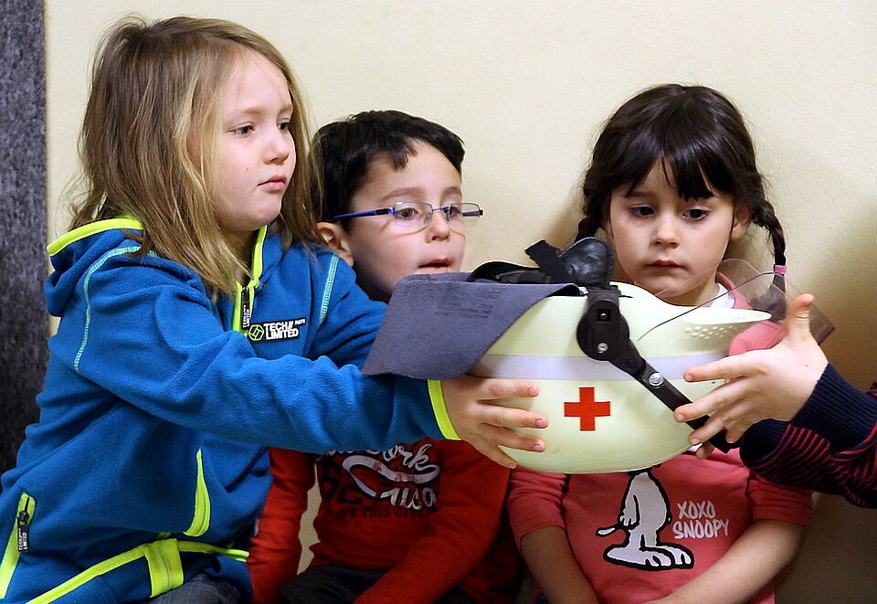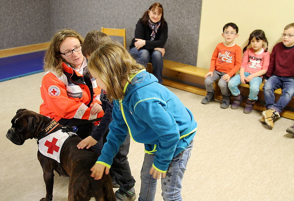 Die drei Hundeführerinnen Carmen Dahm, Kati Köntgen und Manuela Rusterberg kamen für zwei Stunden mit fünf Hunden im Einsatzfahrzeug vorbei. Zunächst erfuhren die Kinder mit ihren beiden Erzieherinnen im Turnraum der Kindertagesstätte spannende und kindgerecht aufgearbeitete Details aus der Rettungshundearbeit. Außerdem gab es Gelegenheit, mit Boxer-Hündin „Musher“ ersten Kontakt aufzunehmen. Das weiche Fell und die feuchte Nase waren für die Kinder eine spannende Erfahrung.