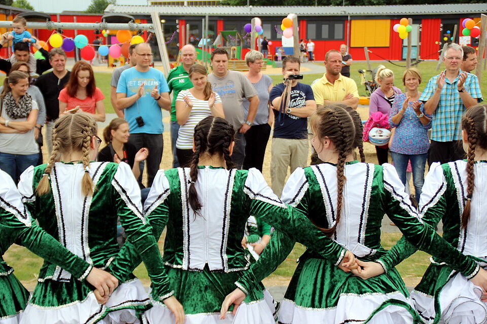 Unzählige Erwachsene und Kinder tummelten sich auf dem weitläufigen Außengelände der Kita. „Wir haben hier viel Spaß“, ist Mutter Sarah Henke begeistert. Liam und Elias, die beiden Dreijährigen, buddeln derweil emsig nach Edelsteinen im Sand.