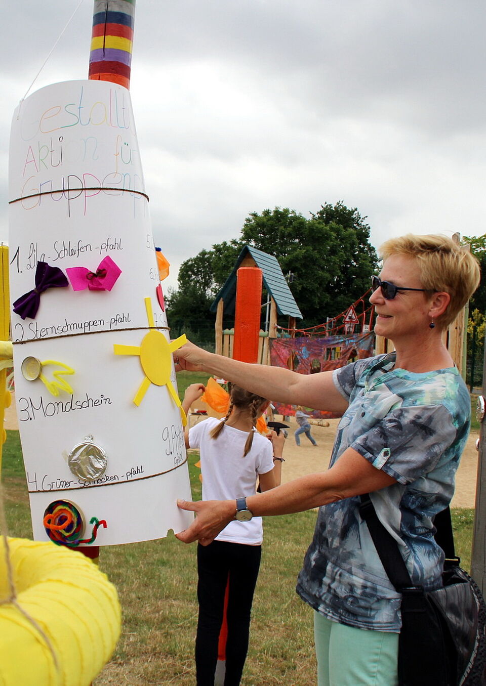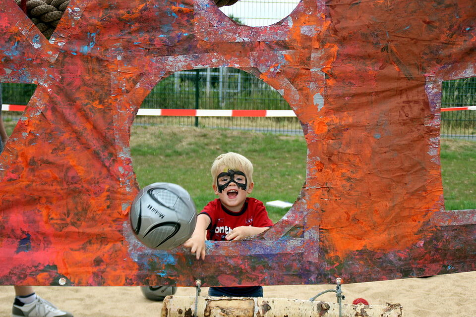 Etliche Attraktionen wurden auf dem weitläufigen Gelände den kleinen und großen Besuchern geboten: wie etwa Ballschießen auf die „verrückte Torwand“, lustiges Kinder-Schubkarren-Wettfahren oder „Wasser marsch“ beim Becher-Umwerf-Spaß. Sogar „Regenbogenpfähle“ konnten von den Kindern bunt verziert werden.