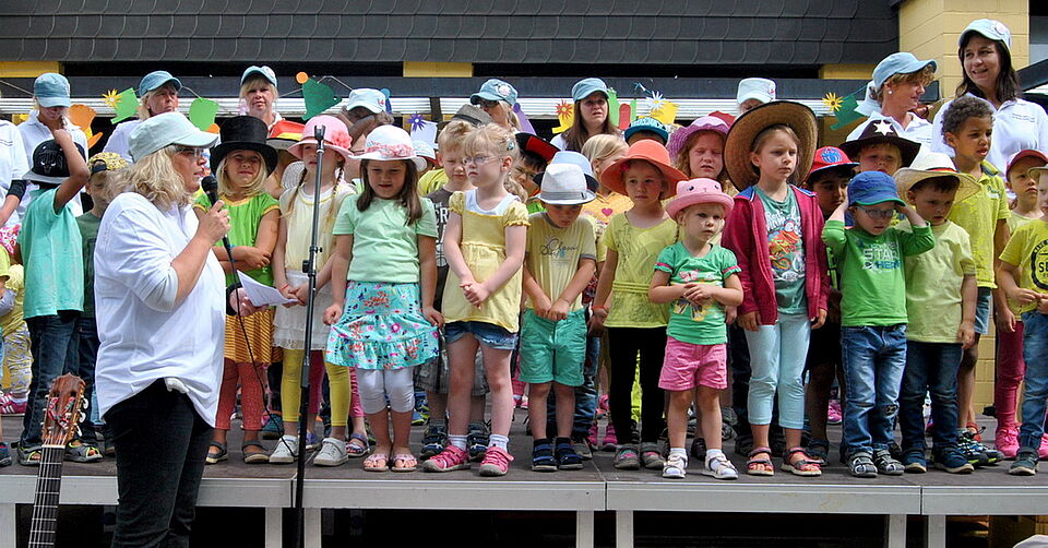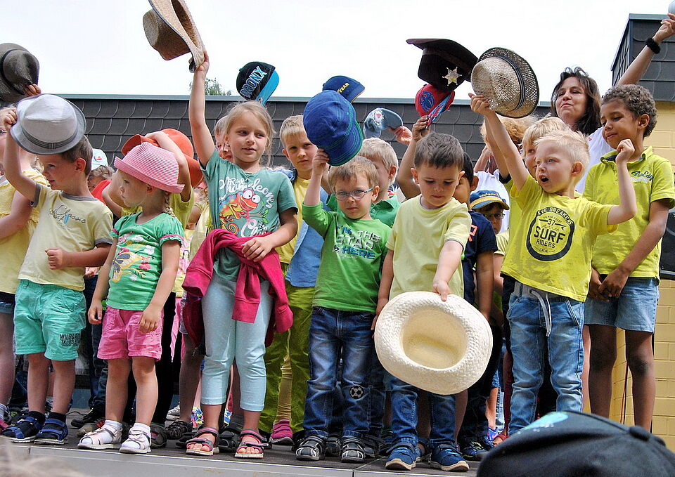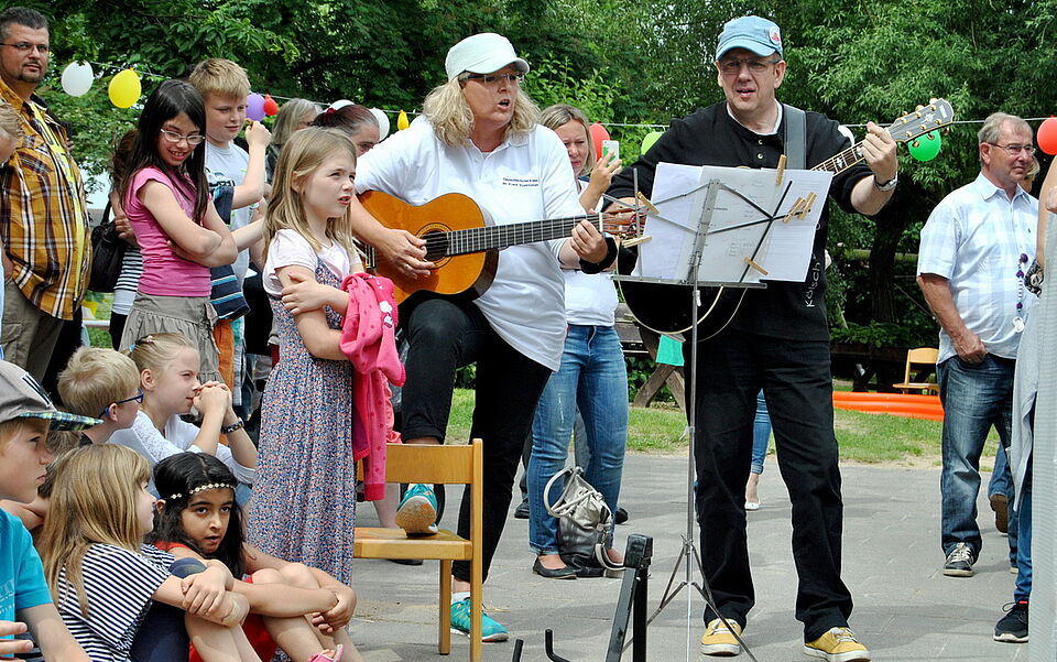 Mit zwei Liedern, die sie nicht nur sangen, sondern auf der Bühne auch spielten, rahmten die Kinder den offiziellen Teil der Feier ein. Dabei nahmen sie Bezug auf das Motto „40 Jahre gut be–hütet/Uns jeit et joot, all unger enem Hoot“. Die Gitarrenbegleitung dazu übernahmen Michaela Mevissen und Ehemann Detlef Mevissen. Danach hatten Groß und Klein viel Vergnügen bei einer Zaubervorstellung, vielen Spielaktionen, Showtanz, einem Luftballonwettbewerb und dem Konzert der sechsköpfigen Band „Kölsch à la Carte“, deren Gründungsmitglied Detlef Mevissen ist. Mit gekonnt gecoverten Hits von Bläck Fööss über Brings bis zu den Höhnern begeisterten sie ihre großen und kleinen Zuhörer und sorgten für einen stimmungsvollen Ausklang des Jubiläumsfestes.