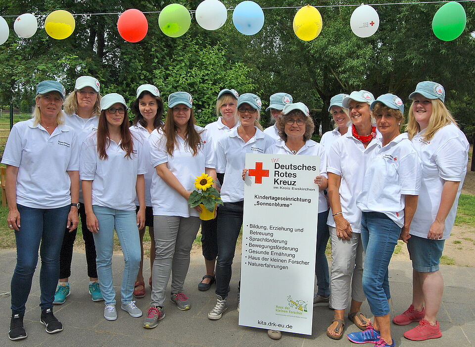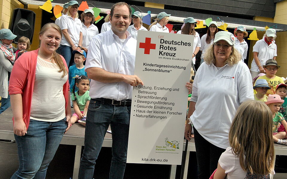 Zum Jubiläum gab es nun auch einen neuen Namen: Weil es mitunter für Verwirrung sorgte, dass sowohl Name als auch Anschrift „Bahnhofsallee“ lauteten, taufte man die Kita zur 40-Jahr-Feier in DRK-Kita „Sonnenblume“ um. Ein Schild mit dem neuen Namen hatte Ralf Krutwig, zuständiger Bereichsleiter beim DRK-Kreisverband, mitgebracht.
