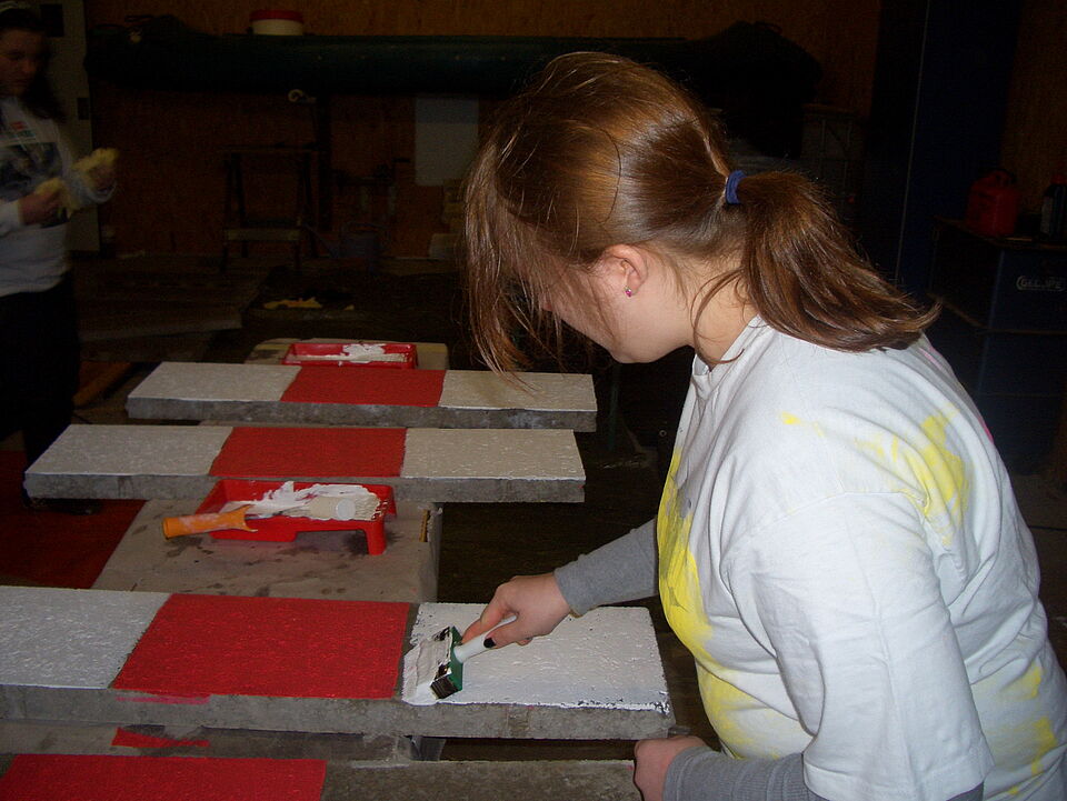 Insgesamt 100 Platten malten die 15 Jugendlichen an ( 50 in rot/weiß und 50 in gelb). Die Jugendlichen waren begeistert bei der Sache, wenn auch der ein oder andere Farbklecks zum Leidwesen der Eltern auf der Bekleidung landete.