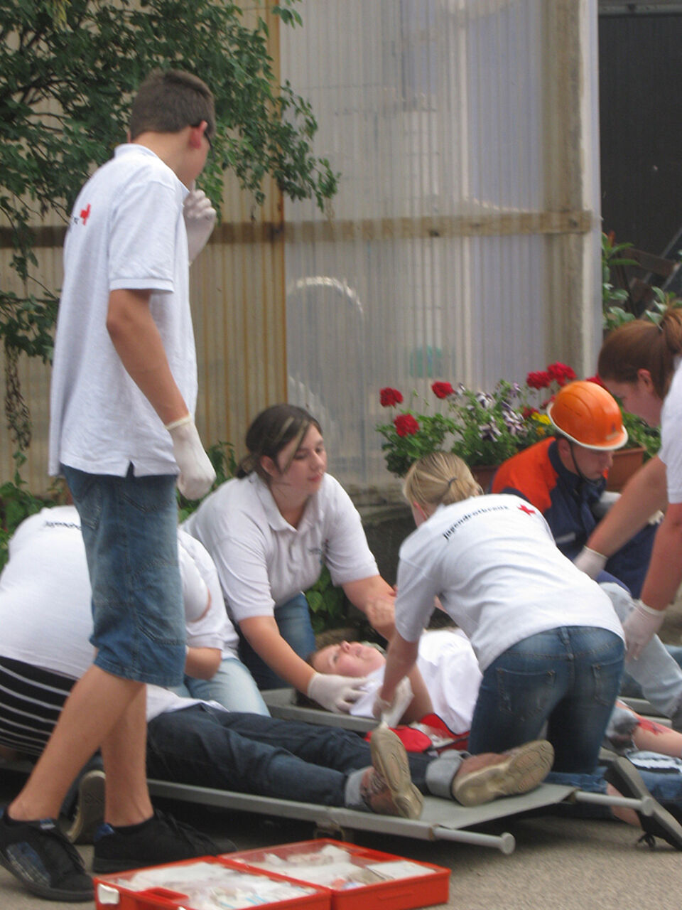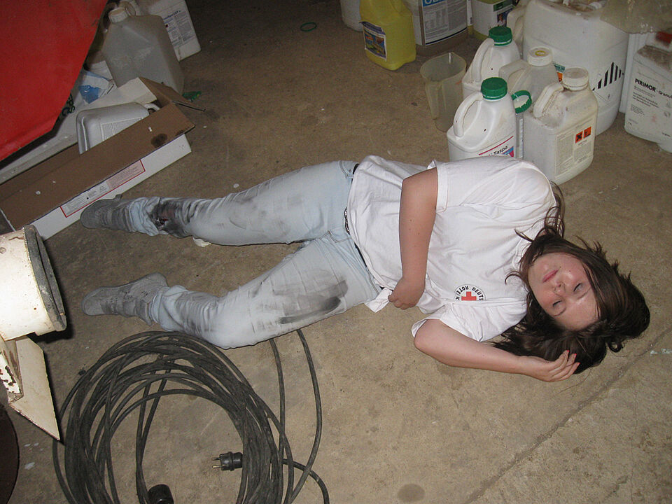 Weilerswist - Am Samstag, den 9.07.2011, stellte Familie Brock uns ihre Scheune für eine Übung gemeinsam mit der Jugendfeuerwehr aus Weilerswist zur Verfügung. Mit 13 JRK´lern und 22 Mitgliedern der JFW inszenierten wir eine Brandlöschung mit Rettung und Erstversorgung von 7 Verletzten.