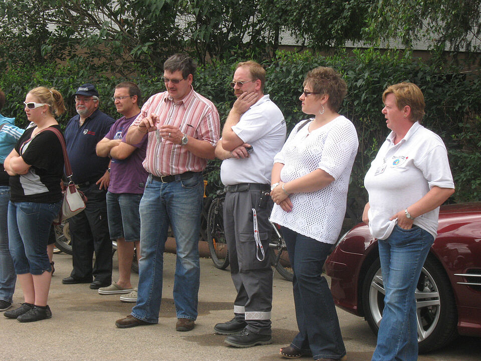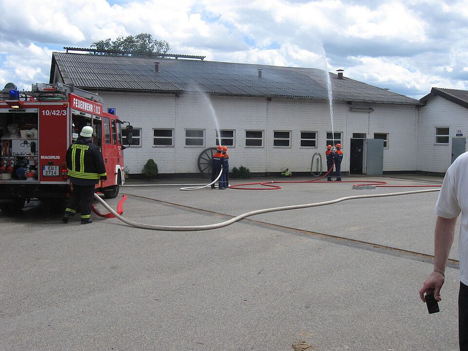 Ohne vorherige Absprache funktionierte auch das Zusammenspiel von Feuerwehr und Rotem Kreuz einwandfrei. Das Spektakel wurde von ca. 100 Zuschauern die sich auf dem Hof versammelt hatten aufmerksam verfolgt.