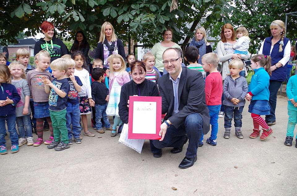 Weilerswist-Großvernich - Als erste Kindertagesstätte im Kreis Euskirchen wurde nun die Rotkreuz-Kita Kirchtal in Großvernich als „Ort des gesunden Aufwachsens“ zertifiziert. Das Zertifikat des Deutschen Roten Kreuzes überreichte Kreisgeschäftsführer Rolf Klöcker an die Kita-Leiterin Iris Böhme. „Es ist nicht so, dass sich der Rotkreuz-Kreisverband hier eine schöne Urkunde ausgedacht hat, sondern das Zertifikat kommt von unserem Dachverband“, erklärte Klöcker den Erzieherinnen, Kindern und Eltern.