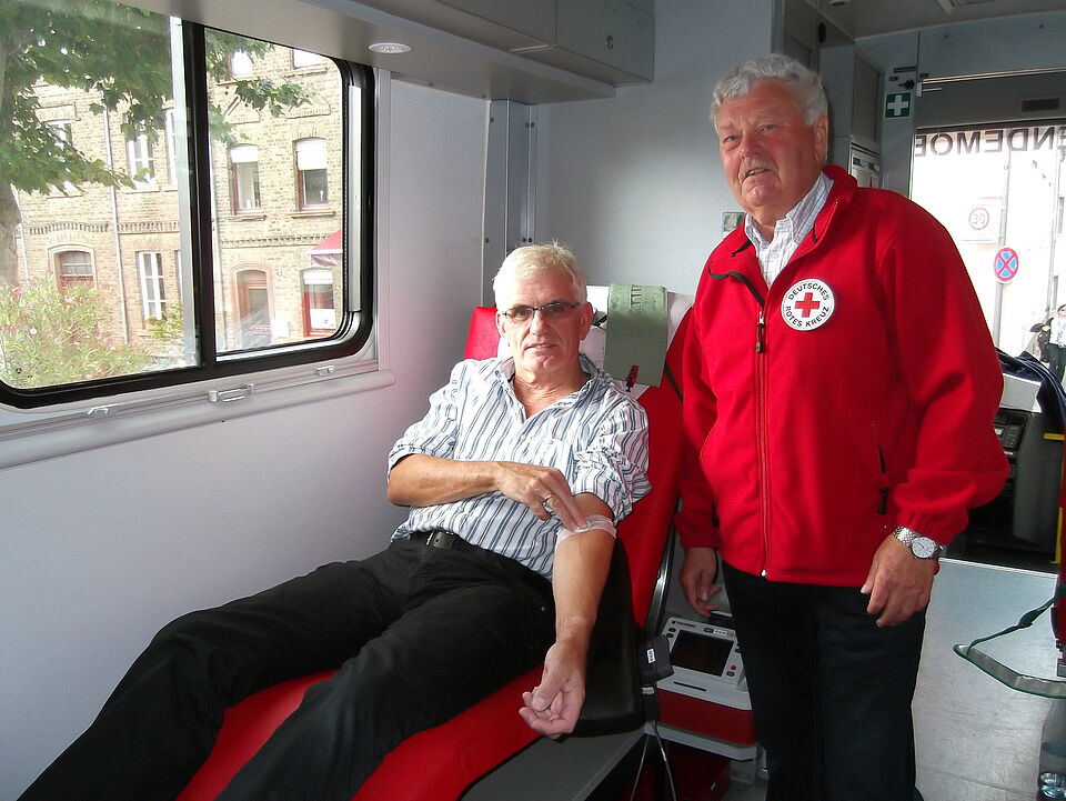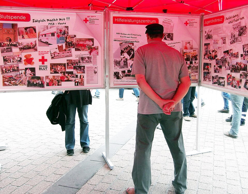 Vorbei an bebilderten Infotafeln, die die 100-jährige Geschichte des Roten Kreuzes aus Zülpich anschaulich nachvollziehen lassen, steht das Blutspende-Mobil aus Breitscheidt. 40 Blutspender sollen an diesem Tag kommen, darunter zwei Erstspender, die unentgeltlich ihren „Lebenssaft“ für andere Menschen spenden. Rotkreuz-Ortsvereinsvorsitzender Lothar Henrich bedankt sich bei den Spendern. „Sie sind anonyme Lebensretter. Denn noch immer sind wir auf Blutkonserven angewiesen. Und die lassen sich nicht künstlich herstellen.“