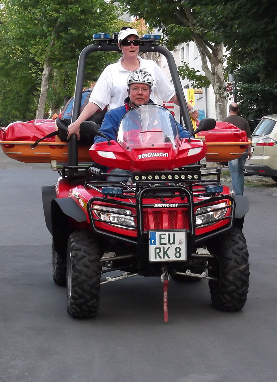 Jugendrotkreuz und Rettungshunde sind aber an diesem Tag nicht die einzigen Präsentationen der Rotkreuzler. Auf dem Marktplatz zeigt das Team um Gaby Schleiermacher die modernen Fahrzeuge des Katastrophenschutzes. Auch die Bergwacht des Roten Kreuzes ist mit dabei. Deren Leiter Rolf Zimmermann ist mit dem Spezialfahrzeug „Arctic Cat“ vor Ort. Das hochmoderne geländegängige Rettungsfahrzeug ist normalerweise im Nationalpark Eifel und im Wintersportgebiet Udenbreth/Hollerath eingesetzt. Neben dem Rettungs-Quad steht das Rettungsboot der Wasserwacht. Der Kaller Ulrich Weigel erklärt die Arbeit eines Rettungsschwimmers. Das Motorboot „Eifel 1“ steht dabei den Helfern auf dem Wasser zur Verfügung, um zum Beispiel hilfebedürftige Schwimmer zu retten.