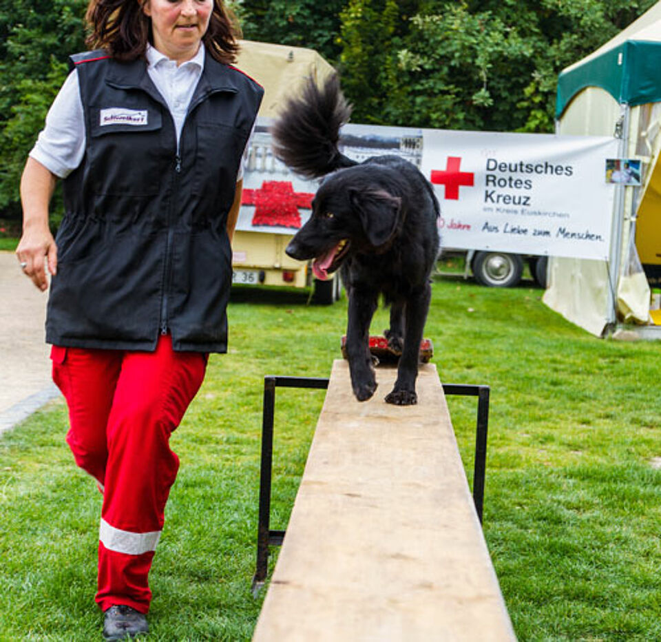 Wacklige Leitern, dunkler Tunnel, Wippe: Elf Hunde der Rotkreuz-Rettungshundestaffel zeigen zusammen mit ihren Hundeführern, dass sie sich von solchen Situationen keinesfalls ablenken lassen dürfen, denn ihr Auftrag ist ernst. „Die Hunde sind in der Lage, vermisste und verschüttete Personen zu suchen“, erklärte die Kaller Rotkreuz-Ausbilderin Julia Tiede. Durch lautes Bellen zeigen die Hunde an, dass sie eine Person gefunden haben. Immer wieder stellen sich interessierte Besucher zu den Übungseinheiten der Rettungshundestaffel hinzu und wollen genau wissen, wie die zwei- bis dreijährige Ausbildung zum Rettungshundeführer abläuft. Die Mitglieder der Personensuchhunde-Einheit kann dabei ein breites Spektrum zeigen: Der jüngste Hund der Truppe ist erst elf Wochen alt und hat gerade erst mit seiner Ausbildung begonnen. Die älteste Diensthündin ist schon elf Jahre alt. Die Labrador-Hündin „Lena“ von Ausbilderin Julia Tiede zeigt schnell und effizient das Aufspüren von „vermissten“ Laga-Besuchern.