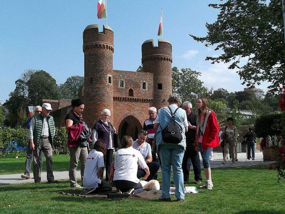 Während sich Kinder farbenfrohe Muster ins Gesicht schminken, liegt ein paar Meter weiter vor dem Zülpicher Weinberg, der für die Landesgartenschau angelegt worden ist, eine Puppe. An dieser können die Besucher die Wiederbelebungsmaßnahmen üben oder auffrischen.