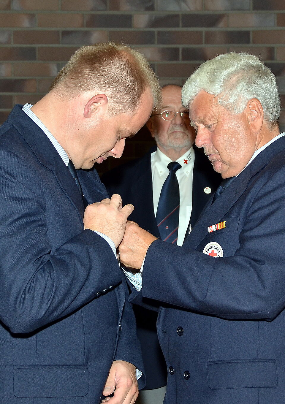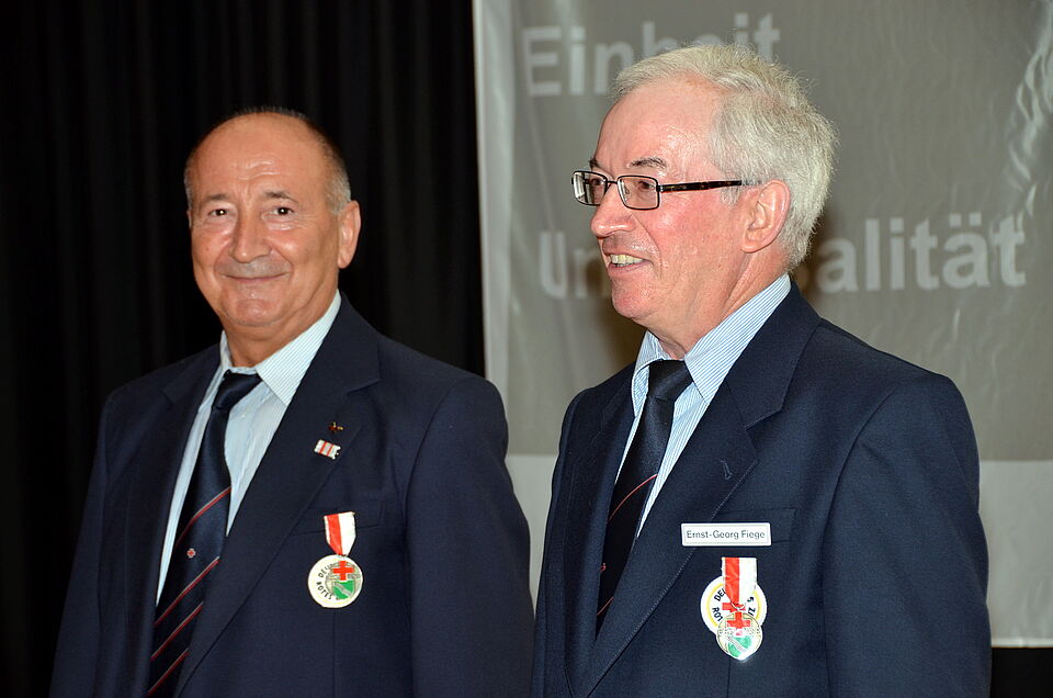 Bei den abschließenden Ehrungen verdienter Rotkreuz-Leute und bewährter Blutspender gab es bei den drei höchsten Meriten überraschte Gesichter. Das galt für den langjährigen Vorsitzenden Dr. Ioan-Teodor Marcea wie für seinen ebenso langjährigen Schatzmeister Ernst-Georg Fiege, denen Ortsvereinsvorsitzender Lothar Henrich die Verdienstmedaille des Rotkreuz-Landesverbandes Nordrhein ans Revers heftete.