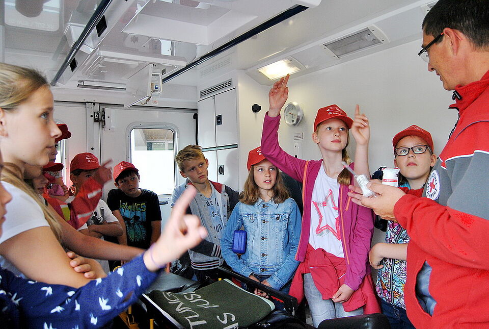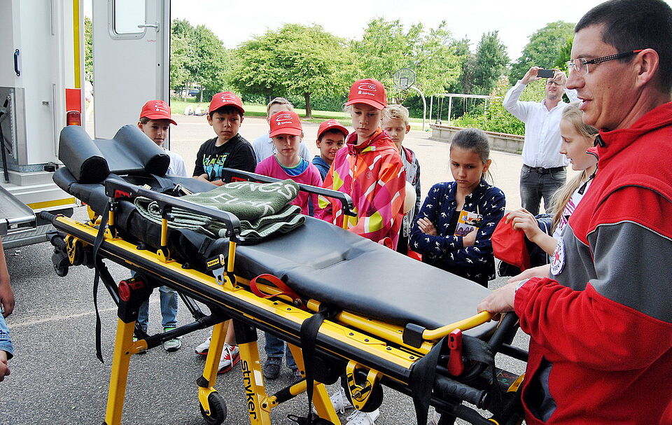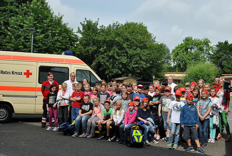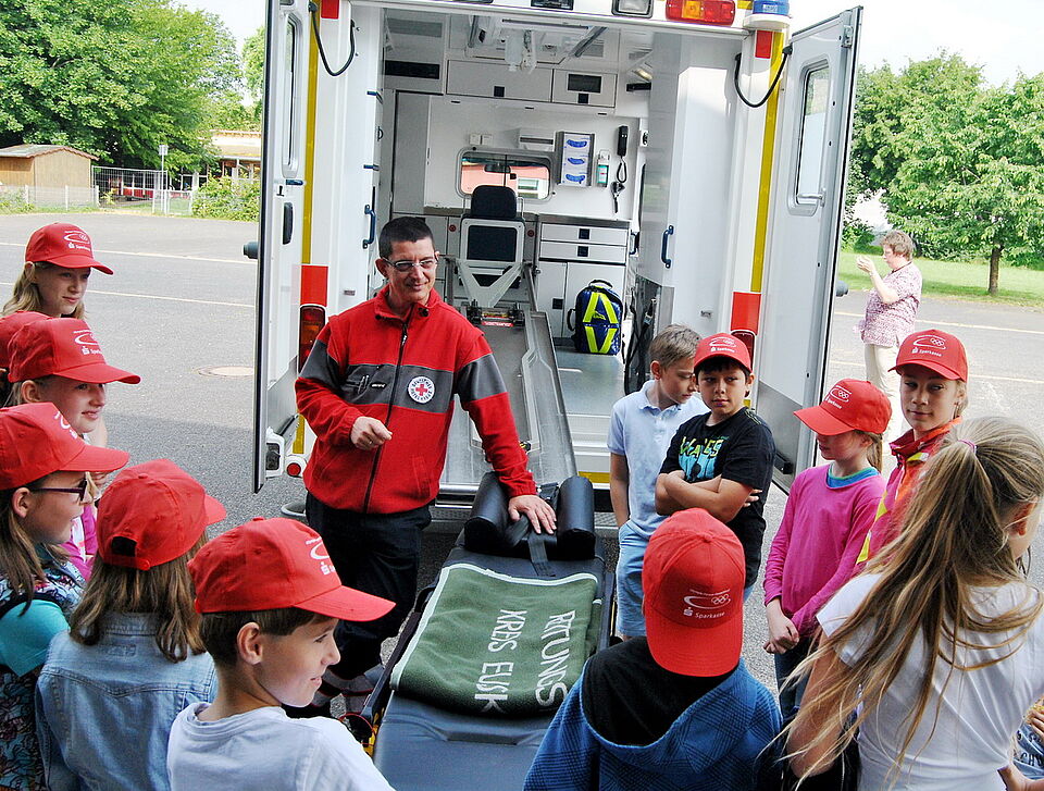 Der spannende Blick hinter die Kulissen der Rettungsfahrzeuge war nicht nur das Highlight der Aktion, sondern hatte durchaus einen tieferen Sinn. „Denn Kinder, die schon früh mit dem Thema Erste Hilfe vertraut sind und einen Rettungswagen ohne Not von innen gesehen haben, sind auch später in Notfallsituationen besonnener, ob sie nun selbst betroffen sind oder anderen Erste Hilfe leisten“, berichtete Patrick Dost, zuständiger Bereichsleiter beim DRK-Kreisverband Euskirchen. Gleichzeitig sei das erfolgreiche Projekt an der Grundschule die Vorstufe zum Schulsanitätsdienst an den weiterführenden Schulen und nicht zuletzt auch Nachwuchswerbung in eigener Sache.