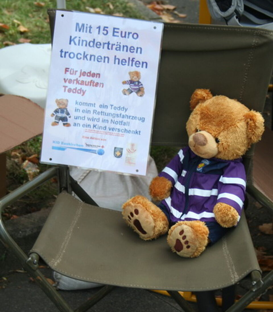 Bild DRK KM | Mit 15€ Kindertränen trocknen, unter diesem Motto steht eine Aktion des Rot Kreuz Krieseninterventionsdienst. Für 15€ können Sie einen Teddybär mit nach Hause nehmen, ein weitere Teddybär wird dem Kreis Euskirchen für seine Rettungswagen gestiftet, damit diese dann an kranke oder verletzte Kinder verschenkt werden können.