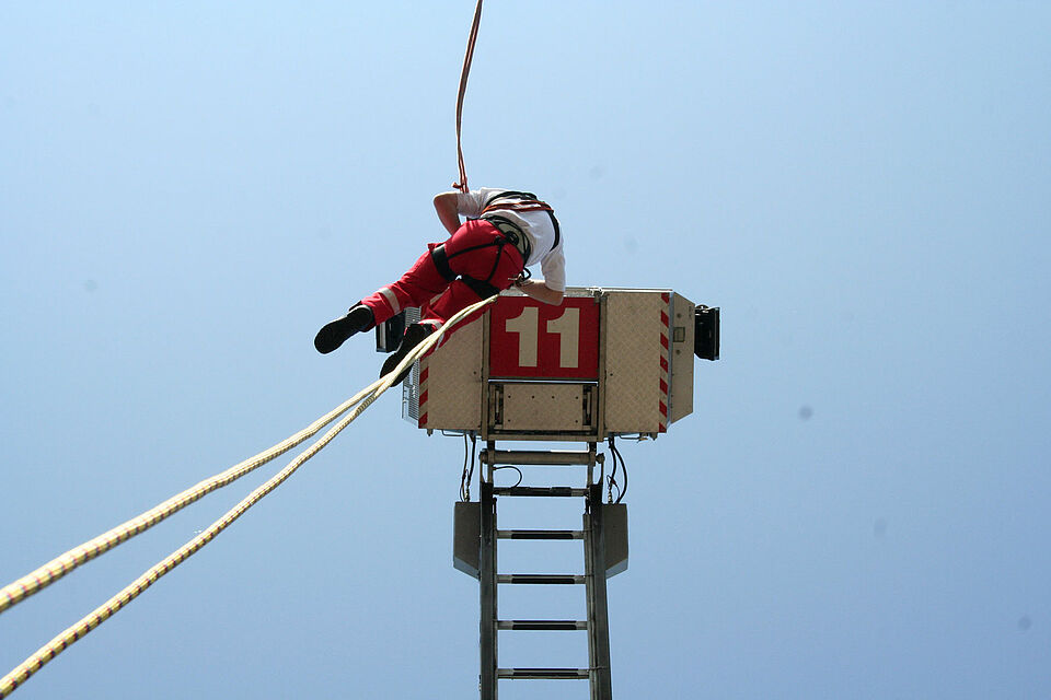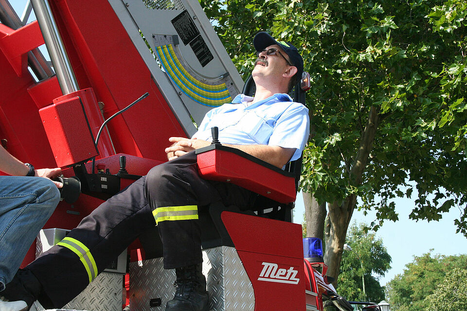 Bild DRK KD | Auf den ersten Blick sieht es aus, als nehme Jockel Wachendorf von der Zülpicher Feuerwehr ein Sonnenbad - jedoch schaut er hier konzentriert auf den Korb der Drehleiter...