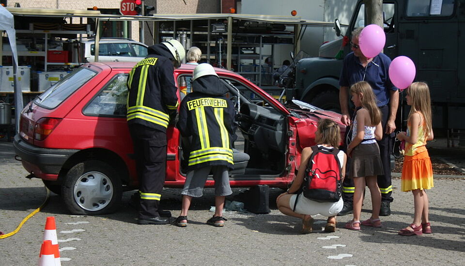 Bild DRK KM |Bei der Feuerwehr konnten die Besucher an einem defektem Auto das schwere Equipment der Feuerwehr ausprobieren... Es kann eine ganz schön schweißtreibende Angelegenheit sein.