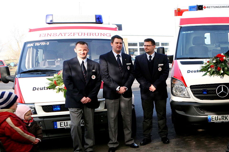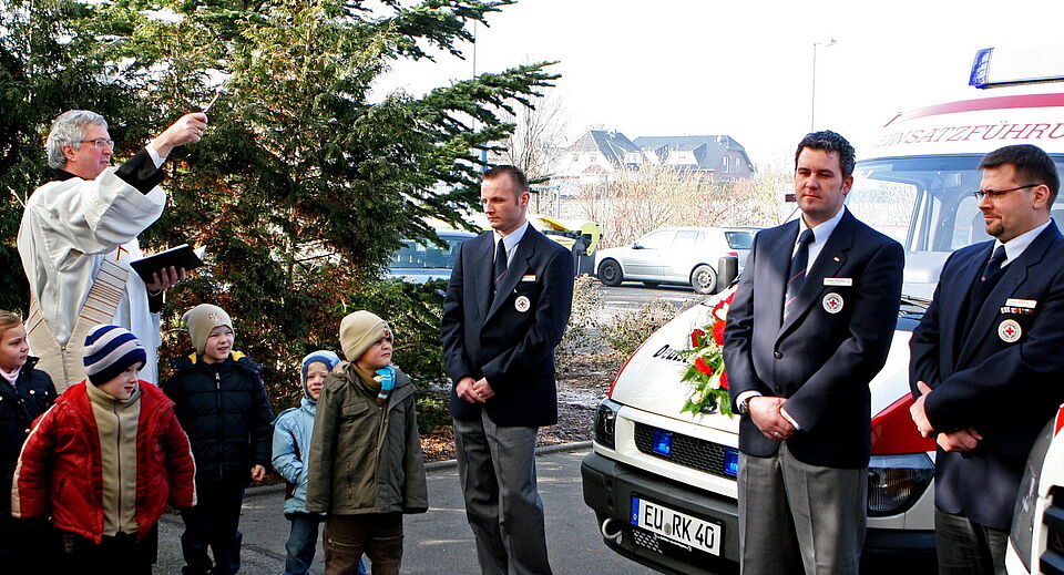 Auf dem Parkplatz weihte Diakon Winfried Krämer einen neuen Einsatzleitwagen und einen neuen Rettungstransportwagen der Zülpicher Ortsgruppe ein, ehe sich die Gäste des Neujahrsempfangs zum gemeinsamen Mittagessen zusammensetzten.