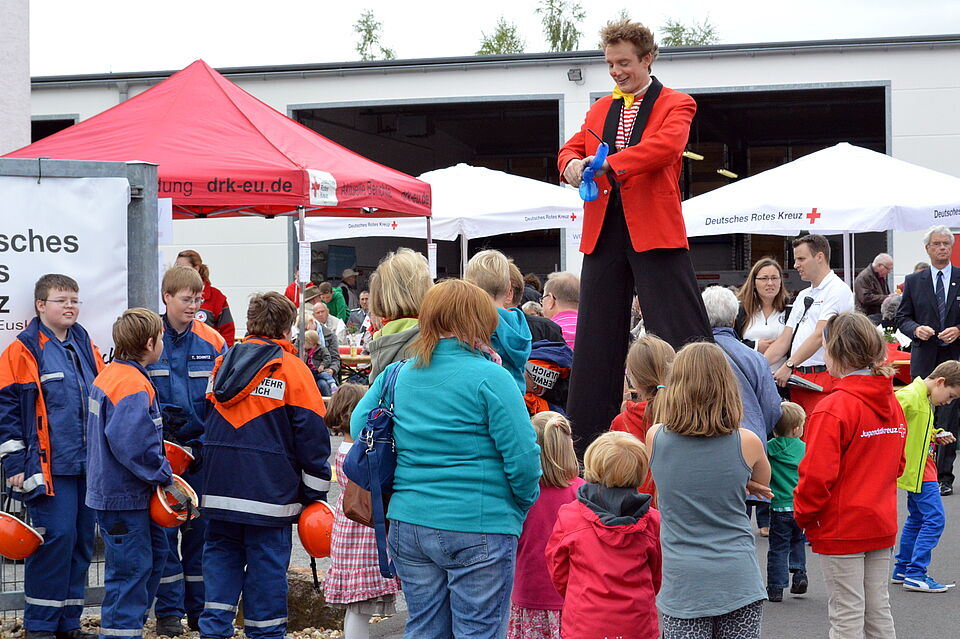 Diese Gelegenheit nutzten die Besucher am Sonntag und kamen in Scharen ins Industriegebiet. Eine Fahrzeugausstellung rechts und links der teilweise gesperrten Industriestraße kündigte bereits einige hundert Meter vor dem Zentrum an, dass hier etwas Besonderes stattfand. Nicht nur die Rotkreuzler selbst präsentierten ihre Einsatzfahrzeuge vom Rettungswagen bis zum Schnellboot der Wasserwacht. Auch Polizei und Bundeswehr beteiligten sich mit außergewöhnlichen Einsatzfahrzeugen an der Schau. Die angekündigte Landung eines Rettungshubschraubers der Bundeswehr konnte zwar nicht stattfinden, weil der Helikopter zu einem Einsatz abkommandiert worden war. Stattdessen „half“ jedoch kurzfristig die Polizei aus und überflog das Gelände mehrfach in niedriger Höhe.