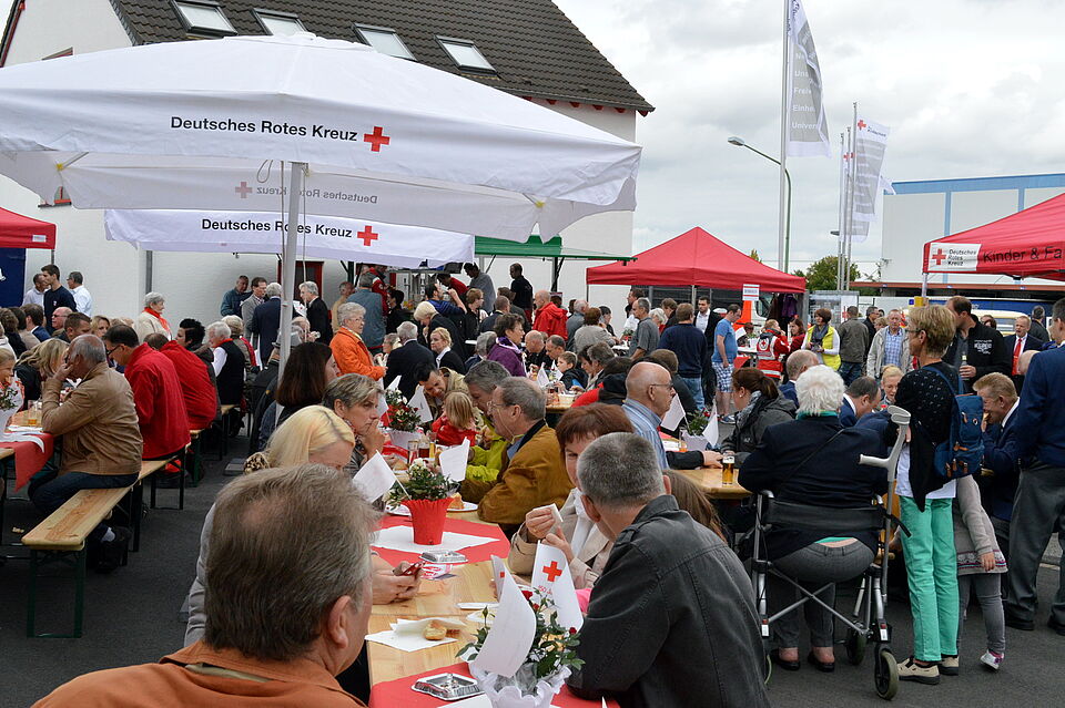 Dicht bevölkert waren auch den ganzen Tag lang Tisch und Bänke vor und in der Fahrzeughalle. Das lag nicht nur an der Dokumentation der 100-jährigen Geschichte auf Schautafeln in der Halle. Vor allem dürfte es das kulinarische Angebot gewesen sein, dass manche heimische Küche kalt bleiben ließ. Während das Team der Stephanus-Schule die Gäste mit Kaffee und Kuchen bewirtete, sorgte das Rotkreuz-eigene Küchenteam unter der Leitung von Chefin Gaby Weinand und Koch Manfred Monnig unter anderem mit leckerer Karotten-Kürbissuppe dafür, dass niemand hungrig nach Hause gehen musste.