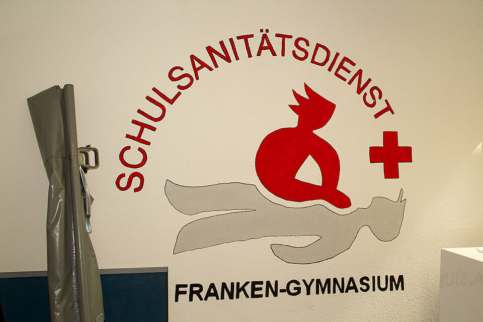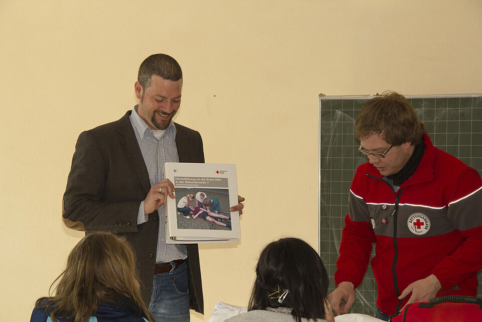 Der Jugendrotkreuz-Kreisreferent Simon Jägersküpper stattete die Schüler und ihren Betreuungslehrer Herr Berg mit T-Shirts, Warnwesten, einer prallgefüllten Sanitätstasche und Postern für den Sanitätsraum aus. Diesen haben die Schüler bereits neu gestrichen und das Schulsanitätsdienstlogo unübersehbar an die Wand gemalt. Zur Weiterbildung erhielt der Lehrer auch noch ein Paket mit allerhand Informationen und Lehrunterlagen zur Ersten Hilfe und zum Jugendrotkreuz.